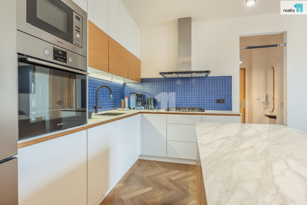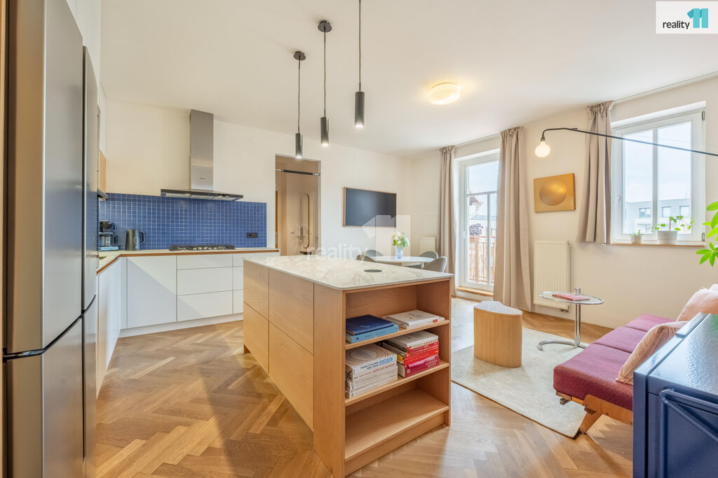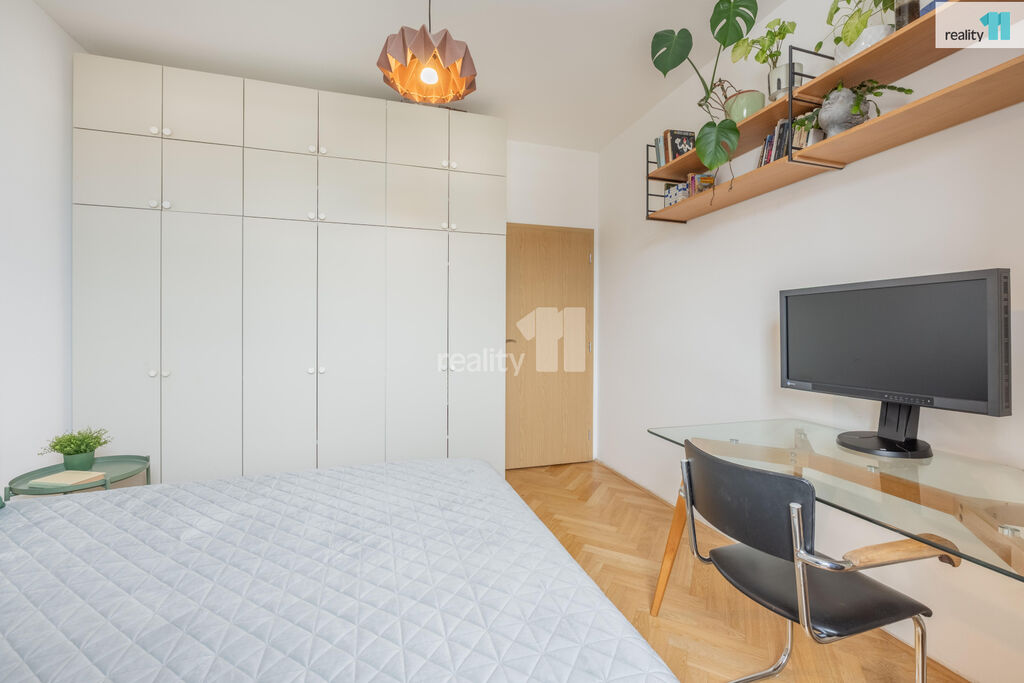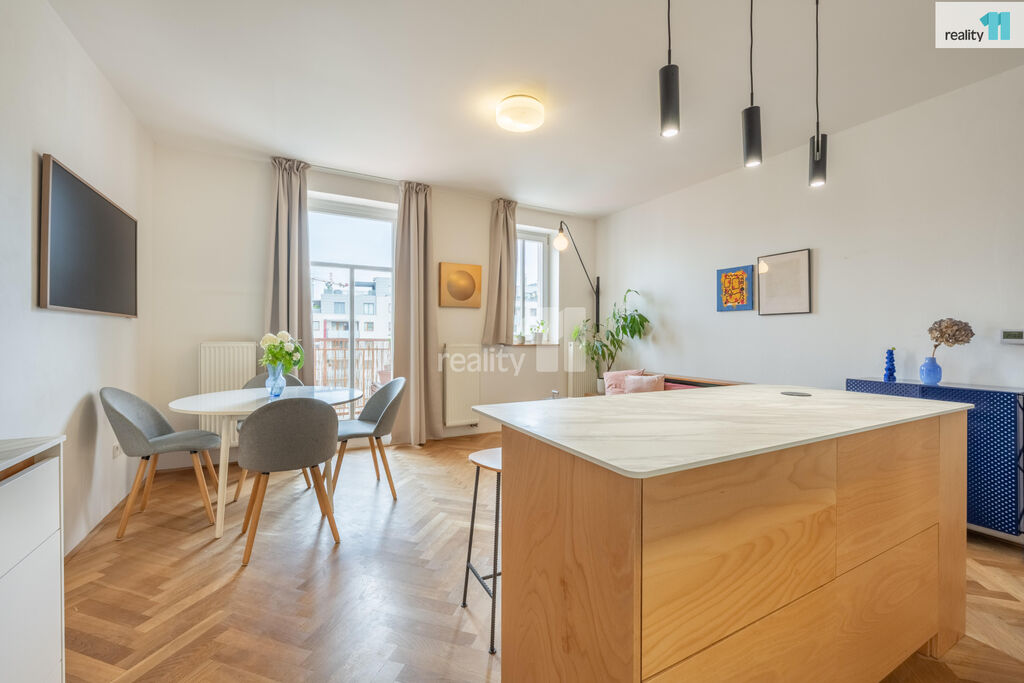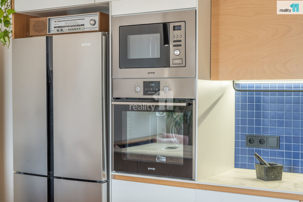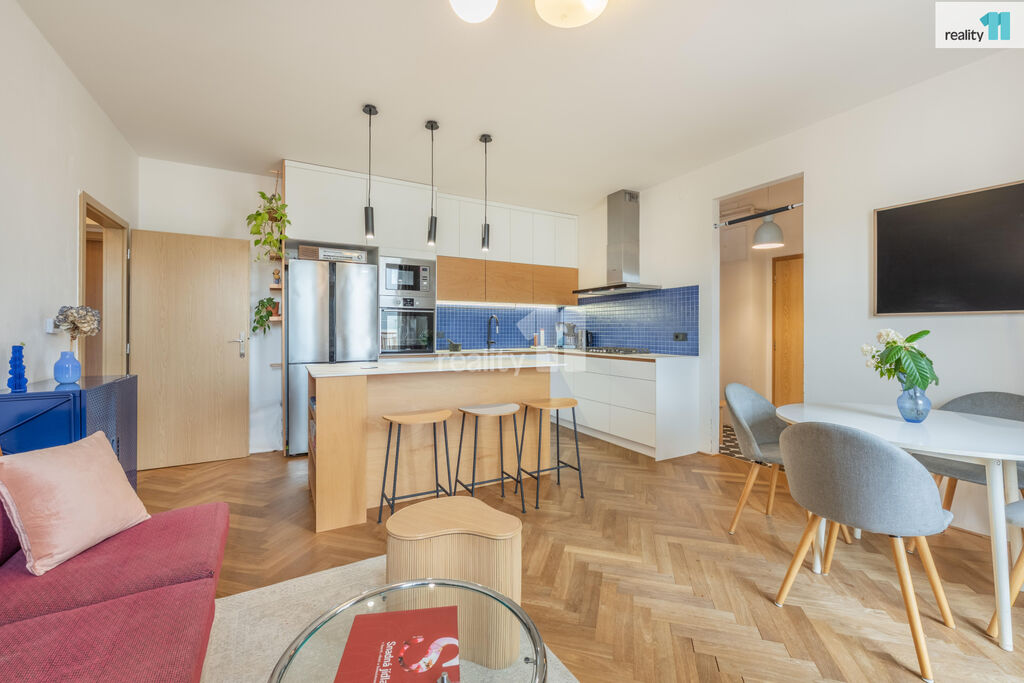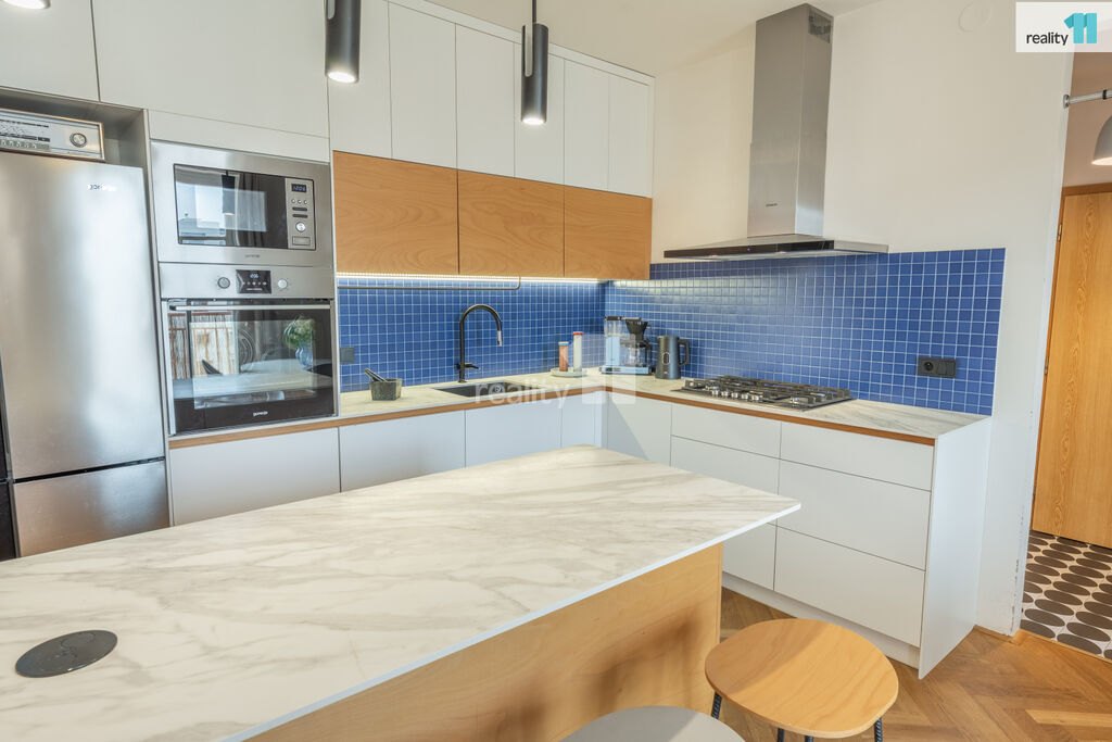 Byt 3+kk o celkové užitné ploše 74 m², z toho 4 m² balkón, který nabízí moderní vzhled, pohodlí města i možnost relaxu v zeleni. S praktickou dispozicí s neprůchozími pokoji. V r.2021 byl zrekonstruován, o nový příjemný a promyšlený design se postaralo architektonické studio. Byt dostal kompletně na míru vyrobenou novou kuchyň, velkou koupelnu, malou koupelnu a předsíň. Vznikl tak krásný, vzdušný, sladěný prostor, kde se prolínají stejné dekory. Dominantním motivem je kombinace bílé, šedé s bukovou překližkou.