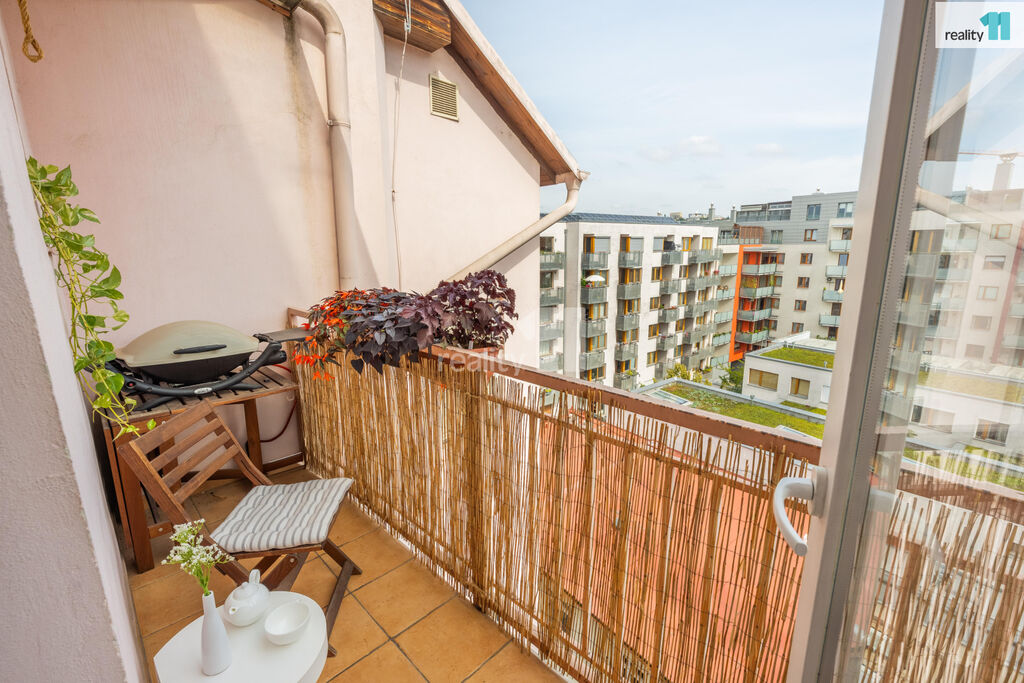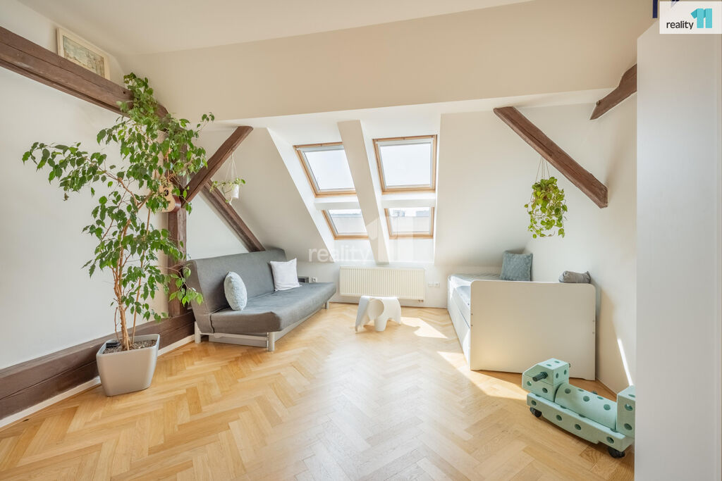 Podlaha je krásná, renovovaná z dubových parket, což je mnohem příjemnější než běžné laminátové podlahy. Plynový kondenzační kotel vám zajistí vytápění i ohřev vody. Byt se nachází v 5. patře v podkroví. Ale nebojte, výtah vás vyveze do mezipatra a těch pár schodů vám rozhodně za to stojí. Na oplátku dostanete klid - nikdo nad vámi, výhled a světlo.