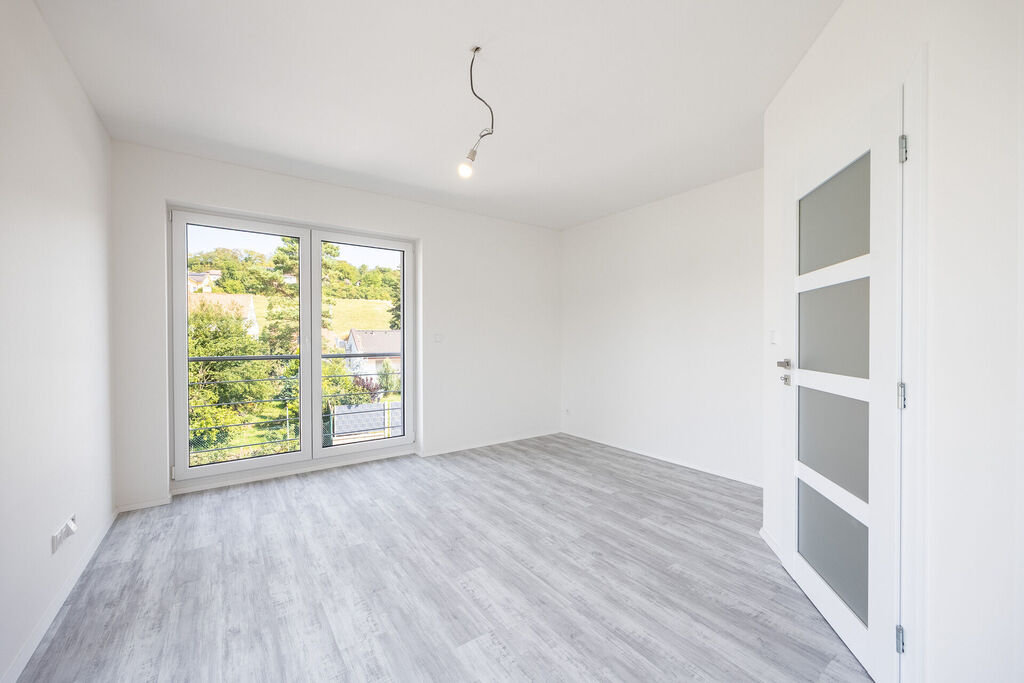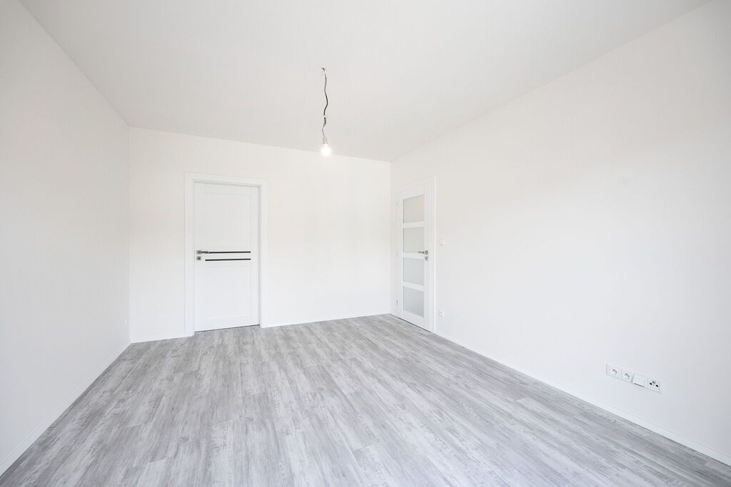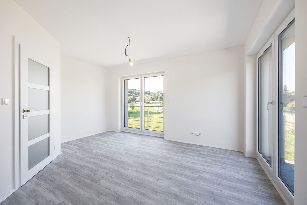 Tříkomorová okna přinášejí do bytu dostatek světla a jsou připravena na instalaci předokenních rolet, což zajišťuje váš komfort a soukromí. Podlahy jsou kombinací vinylu a dlažby, což dodává prostoru moderní a příjemný vzhled.