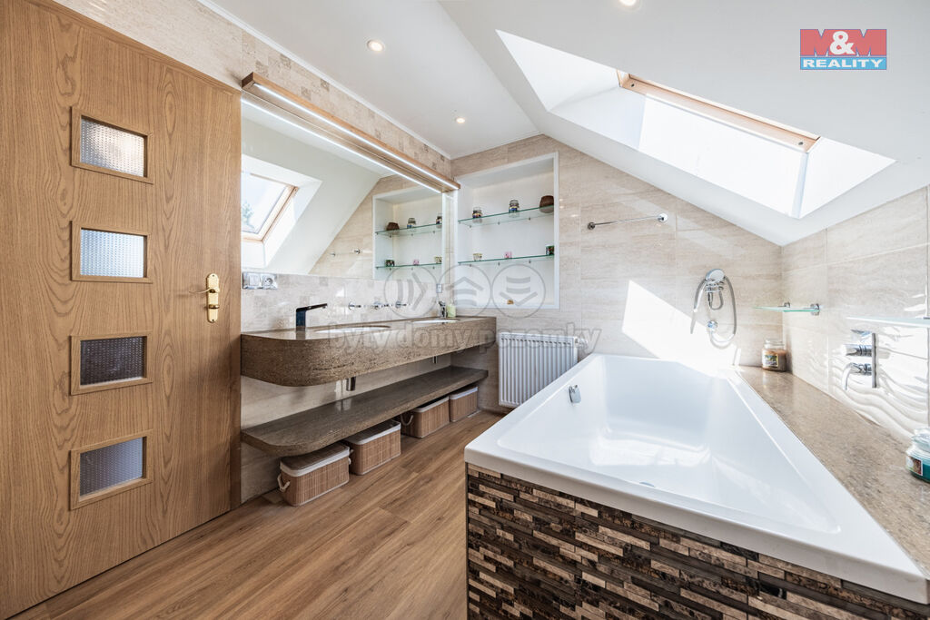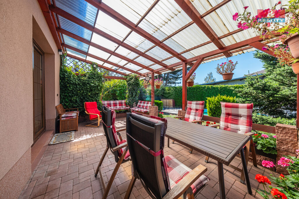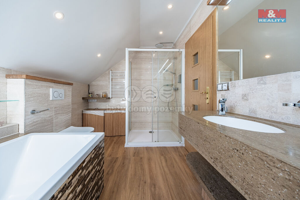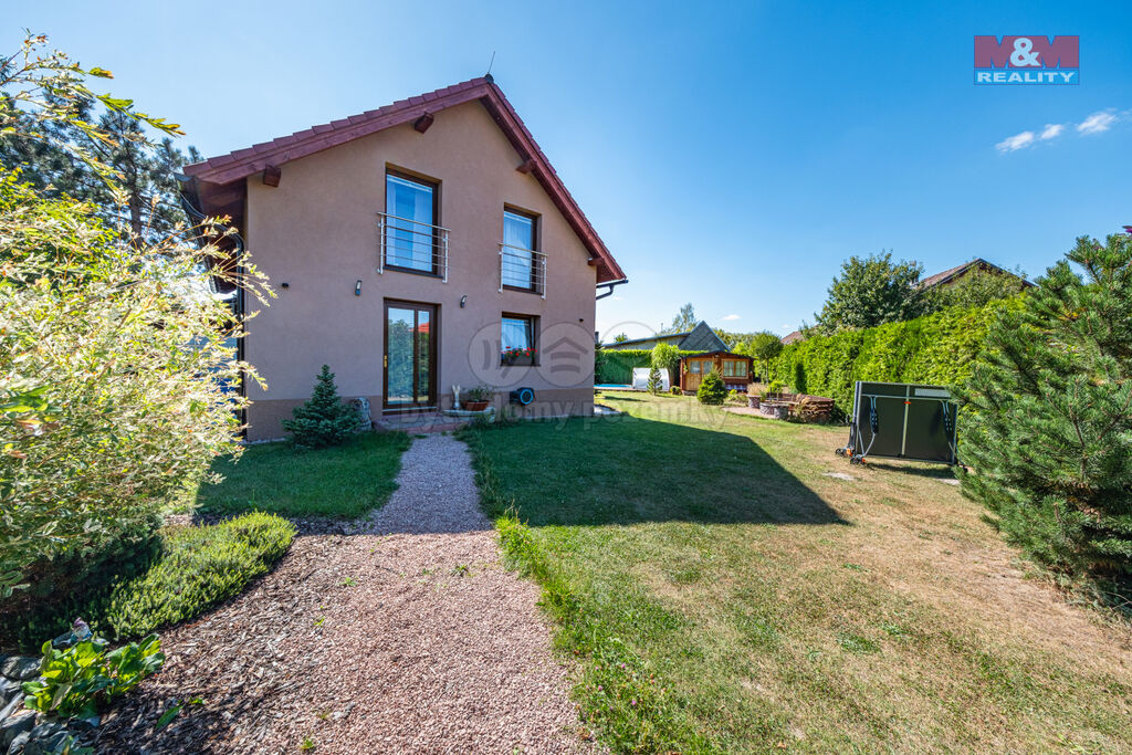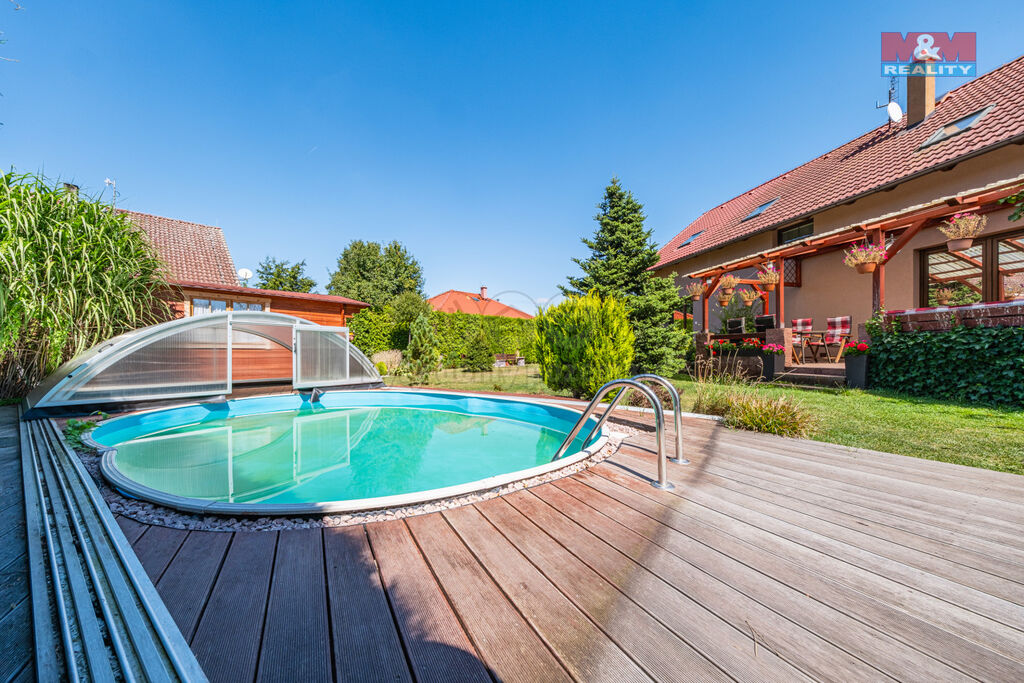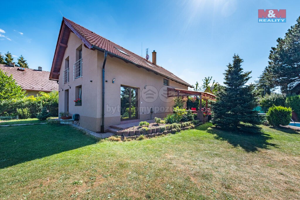 Nabízíme k prodeji velice pěkný, slunný a samostatný rodinný dům 5+kk s terasou, v nadstandardně provedené stavbě z roku 2006, ve Svojeticích u Říčan na P-V. Obytná podlahová plocha místností 159 m2, terasa 18 m2. V přízemí domu se nachází prostorná vstupní hala, předsíň se šatní skříní, WC, sklad, ložnice a velká obývací místnost s kuchyní se spotřebiči Siemens a vstupem přes krásnou pergolu na okrasnou zahradu. V 2.NP se nachází ložnice, 2x dětský pokoj a koupelna s vanou, sprchovým koutem a WC. Velký půdní prostor. Vytápění domu je zajištěno elektrickým kotlem a krbovými kamny na tuhá paliva. Dům je napojen na městskou kanalizaci, vodovod a elektřinu. Na pozemku se nachází bazén s Jacuzzi a zahradní domek s posezením. Většinu hranice zahrady tvoří krásně vzrostlé túje. Kompletní občanská vybavenost - mateřská škola, restaurace, pro koňaře Master Horse Club. Bus zastávka 383, 385,489 jede 45 min. přímý spoj na Prahu - Háje, Opatov. Vřele doporučuji.