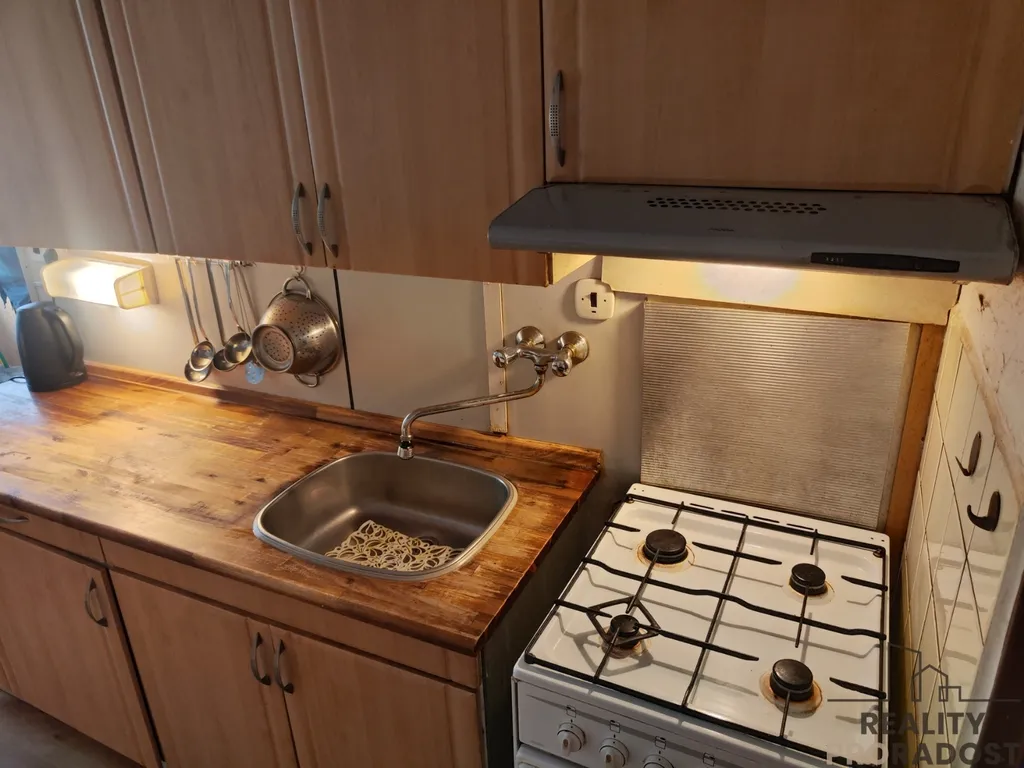 Vstupní chodba je dostatečně prostorná se šatnou a vestavěnou skříní. Z chodby jsou dveře na toaletu, která je průchozí s koupelnou. Dále se jde vlevo do jednoho pokoje, rovně do pokoje s balkónem a také do obývacího pokoje. Ten má dvoje dveře, takže je možné si s prostorem pohrát a vytvořit originální bydlení. Z kuchyně je druhý vstup do obývacího pokoje a naleznete zde zachovalou kuchyňskou linku s plynovým sporákem. Zároveň z kuchyně můžete vejít do koupelny.