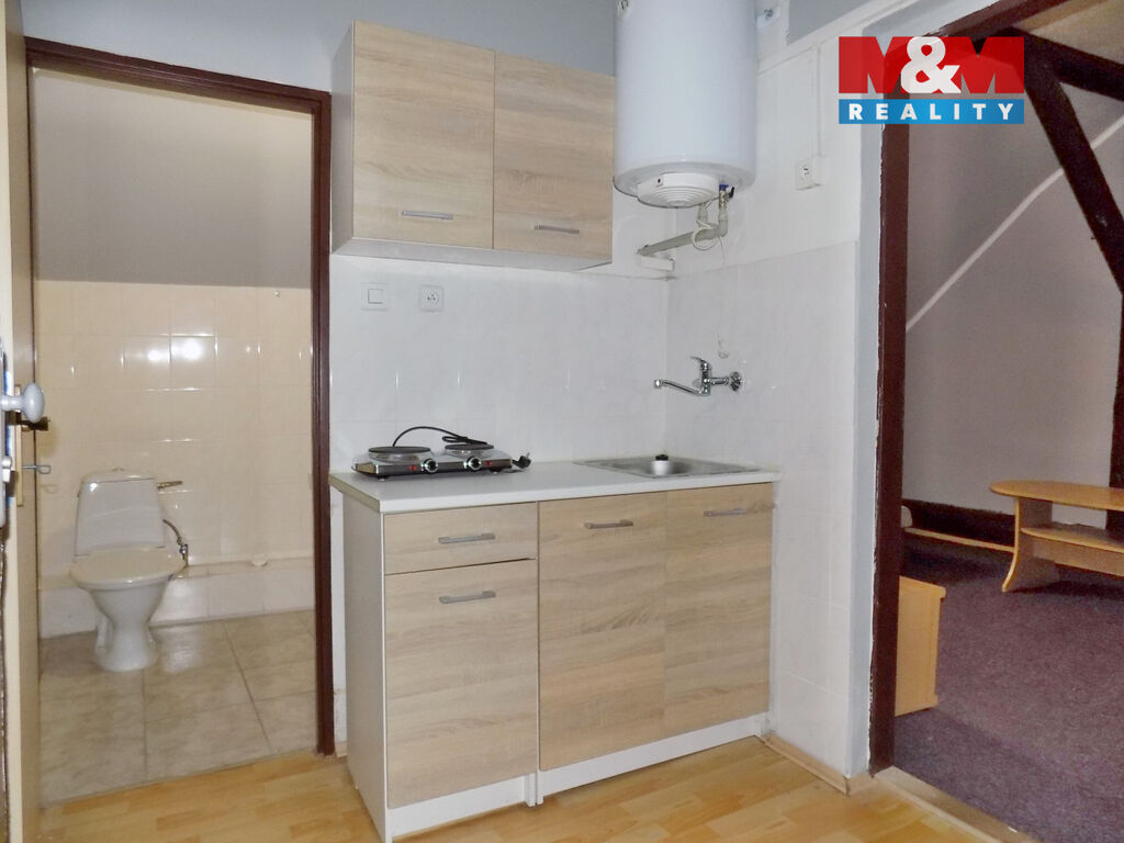 Nabízíme pronájem podkrovního bytu 1+kk o celkové ploše 30 m2, v cihlovém domě v centru lázeňského města Teplice. Byt je vybaven kuchyňskou linkou. Koupelna s vanou, umyvadlem a toaletou. Ohřev vody je zajištěn elektrickým bojlerem, vytápění elektrickým přímotopem. Měsíční nájemné činní 6.500,- Kč/ 1 os., vratná kauce 13.000,- Kč a poplatek realitní kanceláři 8.000,- Kč. K nájemnému je potřeba přičíst platbu za služby (elektrická energie, voda, úklid společných prostor). Elektřina bude převedena na nájemníka. Voda dle aktuální spotřeby, odečet každý měsíc. Dům postupně prochází revitalizací, bydlí zde slušní nájemníci. Pro pracující klienty. Upřednostníme dlouhodobý nájem. Pro více informací volejte makléře.