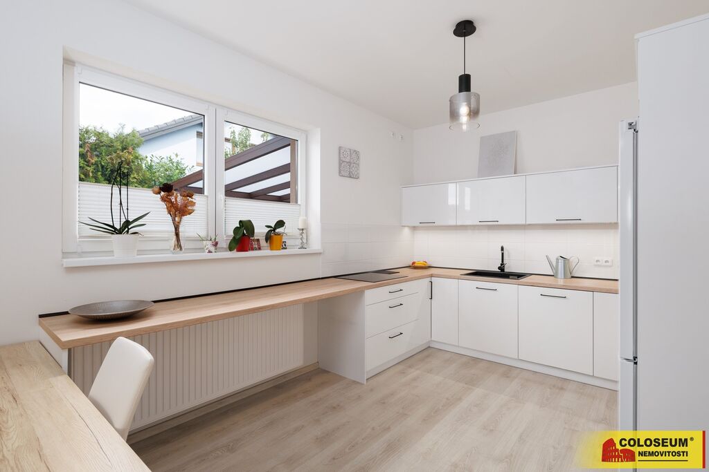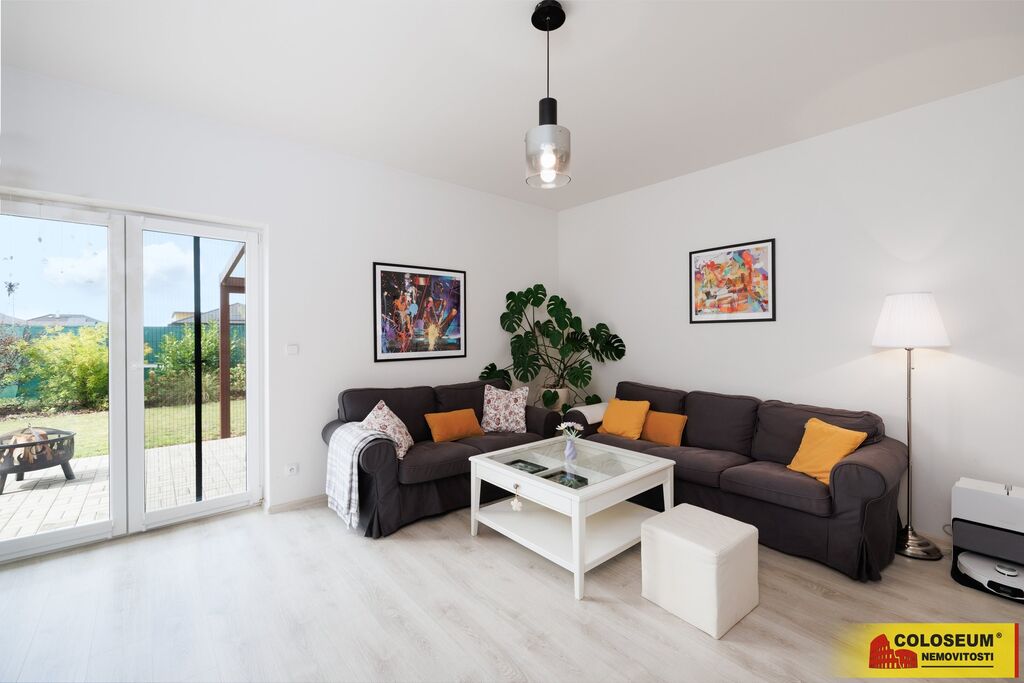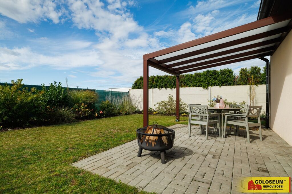 Byt disponuje třemi neprůchozími pokoji, prostornou koupelnou s vanou v teplých přírodních tónech (společnou s toaletou) a velkorysým obývacím pokojem s kuchyní, ze kterého je přímý vstup na terasu krytou pergolou a dále na zatravněnou zahrádku s okrasnou výsadbou. Vlastní pozemek má výměru 257m2.