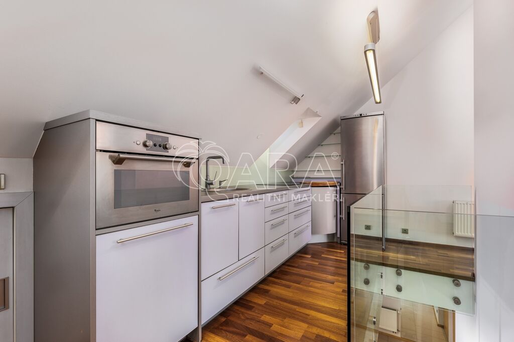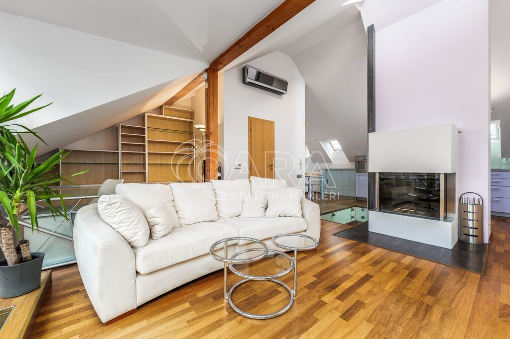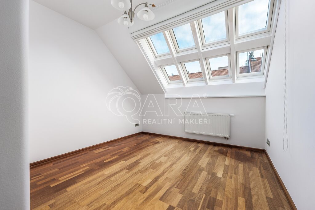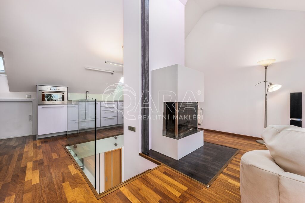 Tento designový byt se nachází v pátém a šestém podlaží udržovaného secesního domu s výtahem. Nadčasový interiér je řešen s důrazem na kvalitu a design. Ve spodním podlaží se nachází dvě ložnice s atypickými skleněnými dveřmi a roletami Maroon. V obou pokojích jsou kvalitní podlahy z exotického dřeva. Mezi oběma ložnicemi je uzavíratelná prostorná šatna s policovým a závěsným systémem vyrobeným na zakázku. Za