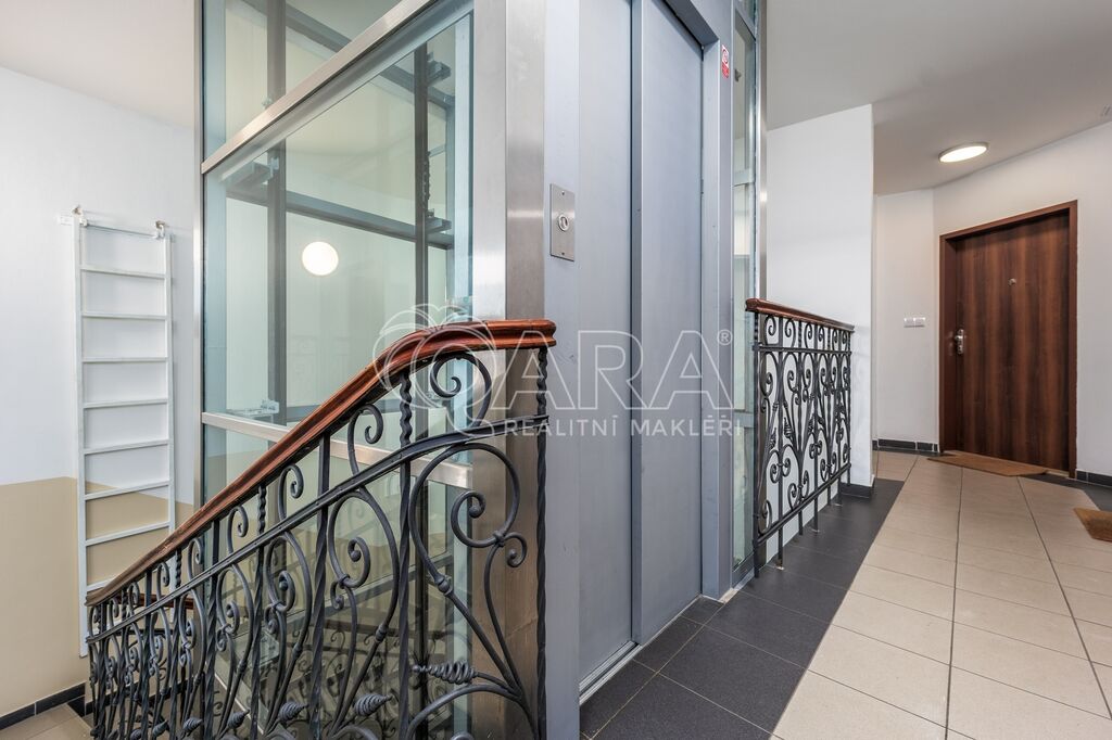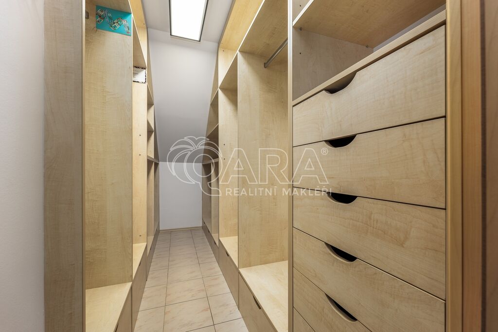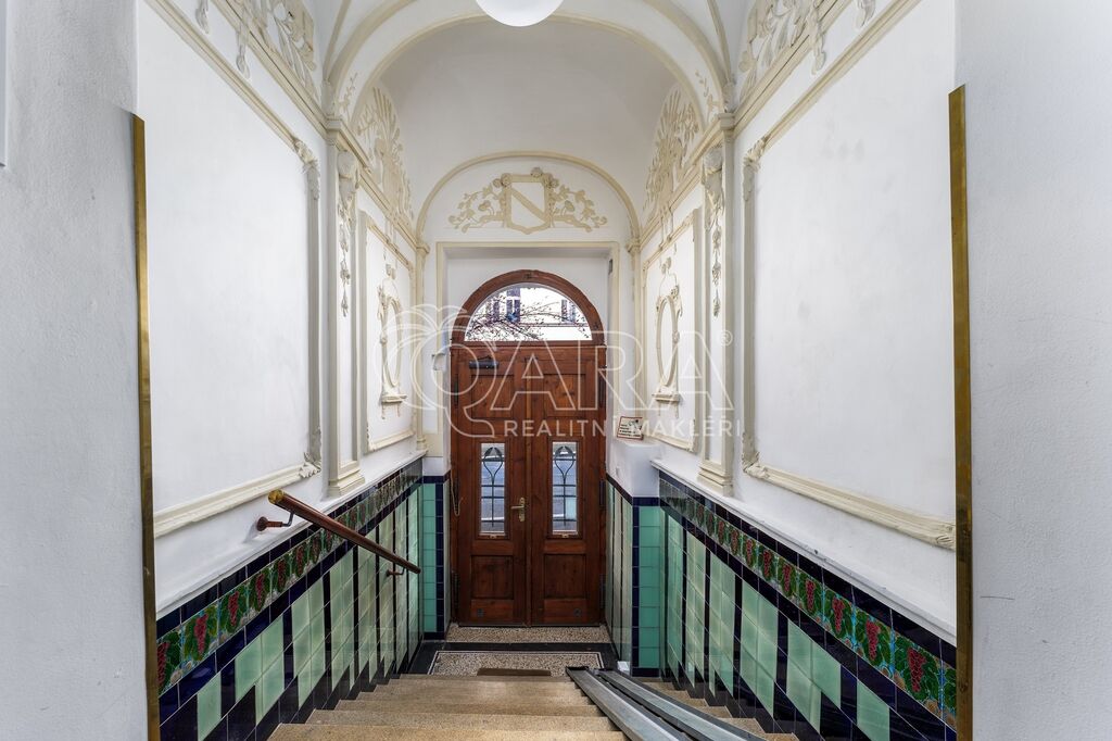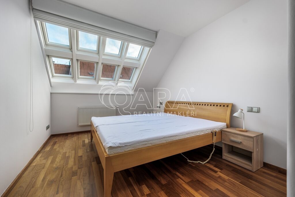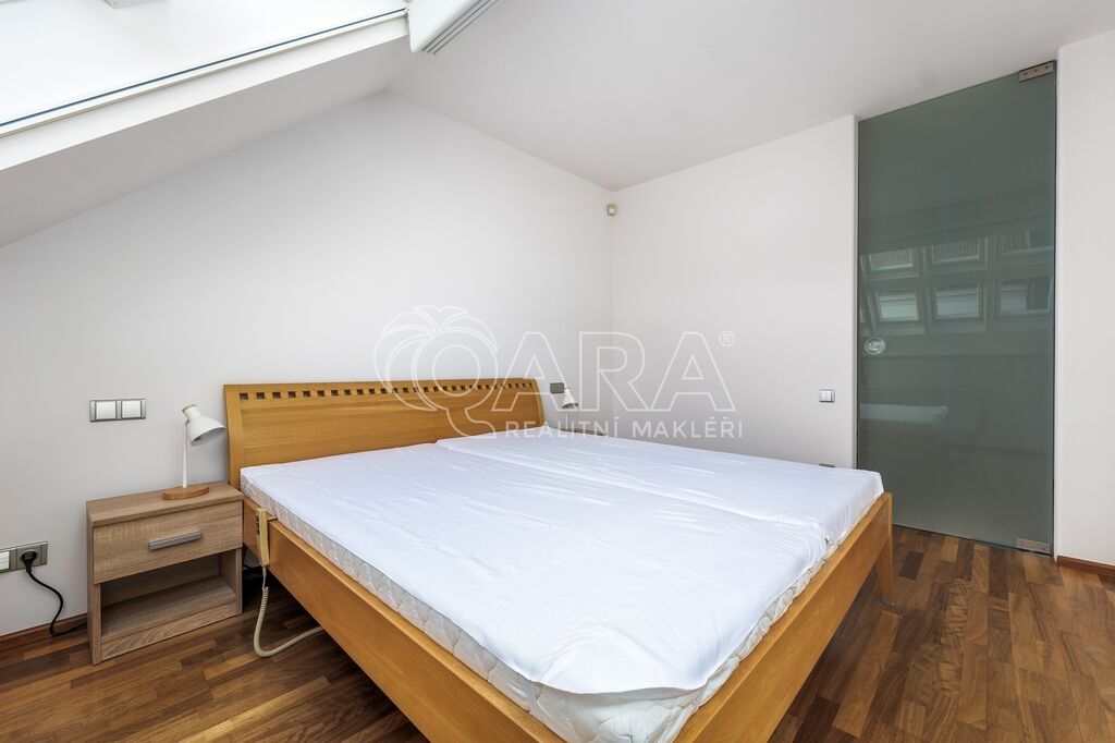 Tento designový byt se nachází v pátém a šestém podlaží udržovaného secesního domu s výtahem. Nadčasový interiér je řešen s důrazem na kvalitu a design. Ve spodním podlaží se nachází dvě ložnice s atypickými skleněnými dveřmi a roletami Maroon. V obou pokojích jsou kvalitní podlahy z exotického dřeva. Mezi oběma ložnicemi je uzavíratelná prostorná šatna s policovým a závěsným systémem vyrobeným na zakázku. Za