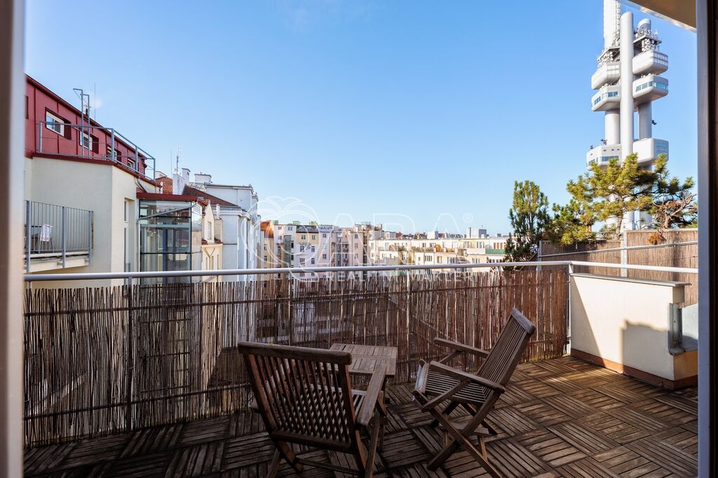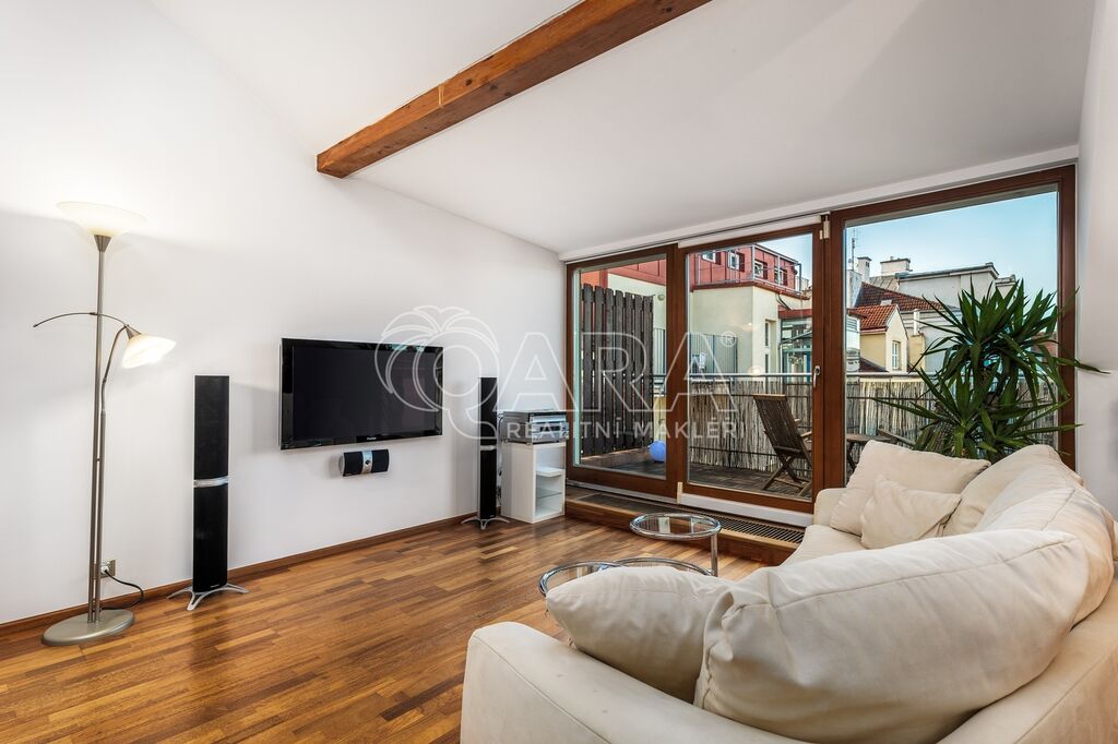 Pronájem slunného nadstandardního mezonetové bytu 3+kk s terasou a sklepem o celkové ploše 97 m2 v žádané lokalitě pražských Vinohrad, Praha 3, ulice Velehradská v těsné blízkosti náměstí Jiřího z Poděbrad.