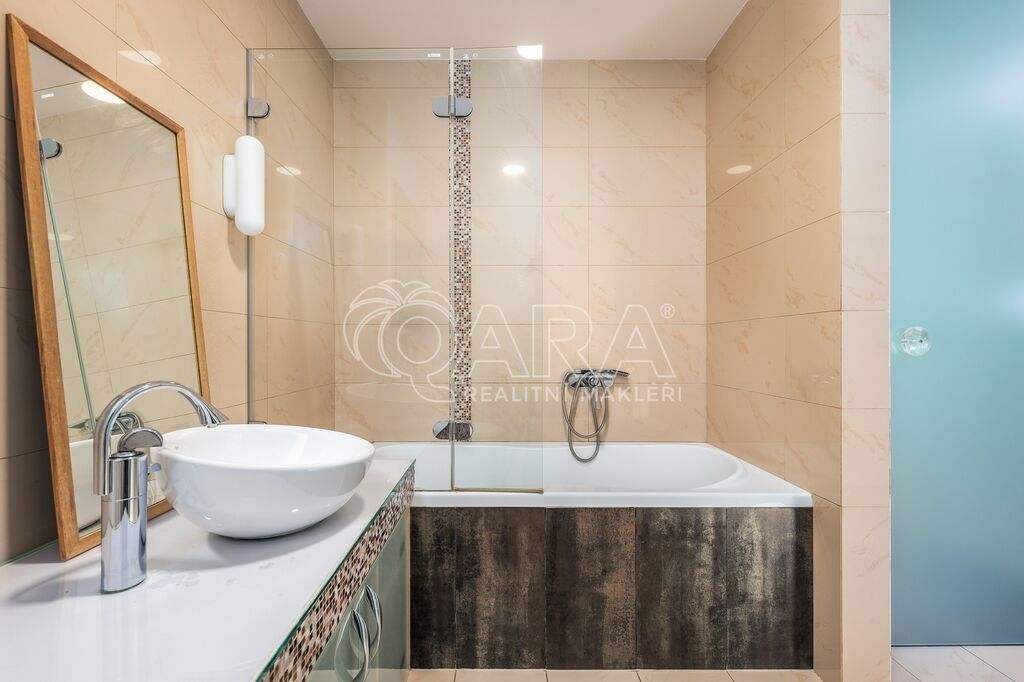 prosklenými posuvnými dveřmi je útulná koupelna s vanou a sprchovou zástěnou, toaletou, umyvadlem se skříňkou, pračkou, otopným žebříkem a podlahovým vytápěním. Osvětlení Artemide a designové baterie. V prostorné chodbě je vestavěná skříň s osvětleným botníkem.