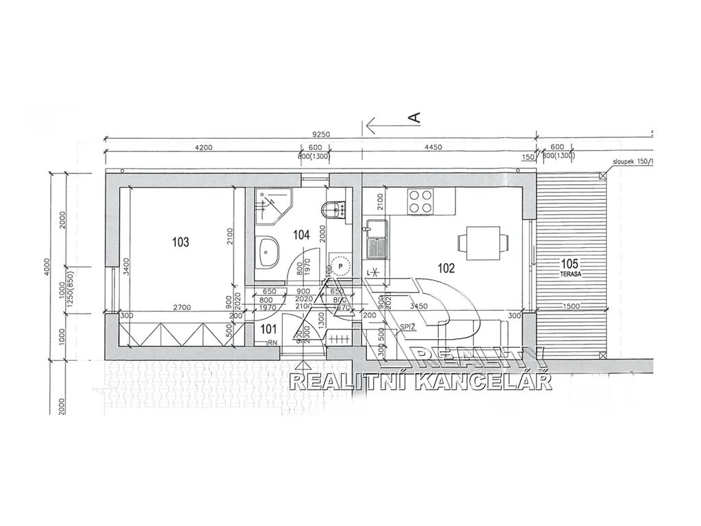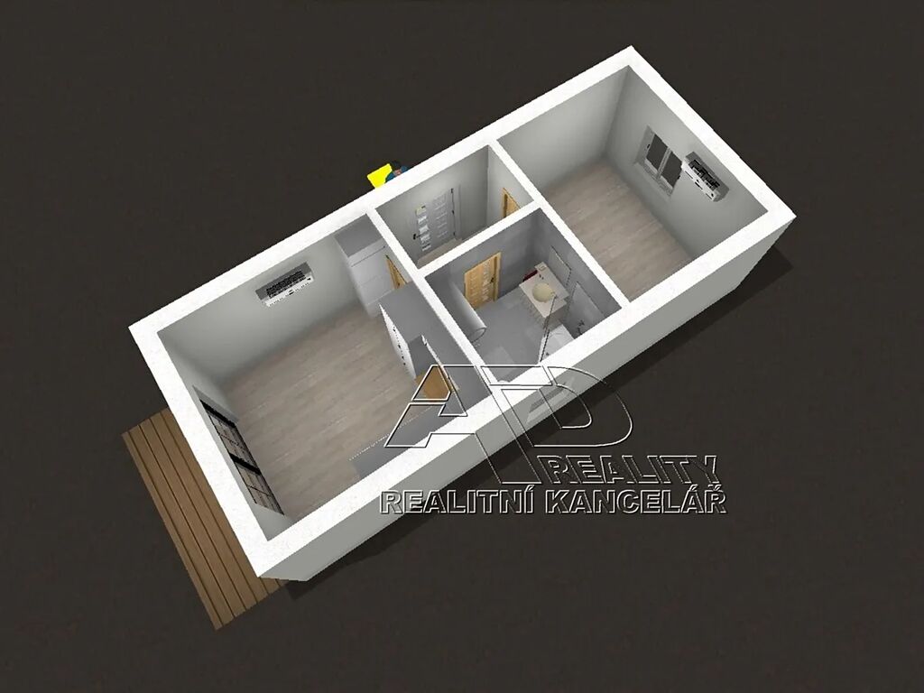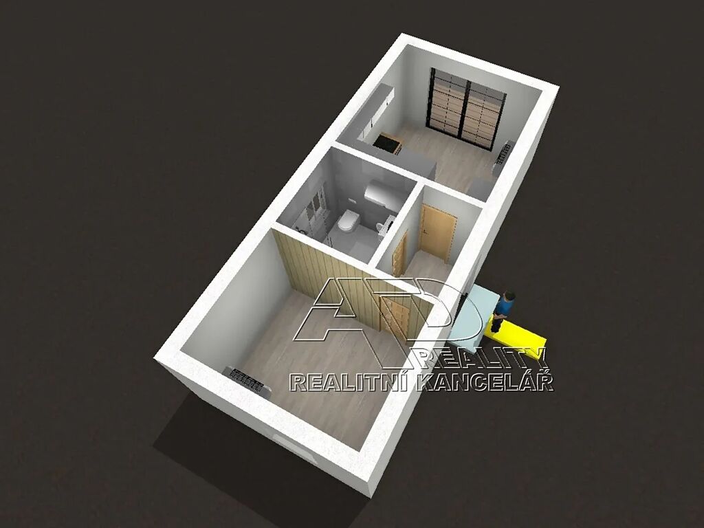 Dispozice: předsíň [3.1m2], obytná místnost [12m2] s kuchyňským koutem a přístupem na terasu, ložnice [9.2m2] a koupelna/WC [3.8m2]. Orientace obýváku / terasy na jih do zahrady, ložnice na sever.