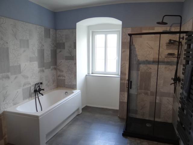 • velkou koupelnu (12,6 m²) s vanou, sprchou, WC a designovým radiátorem
