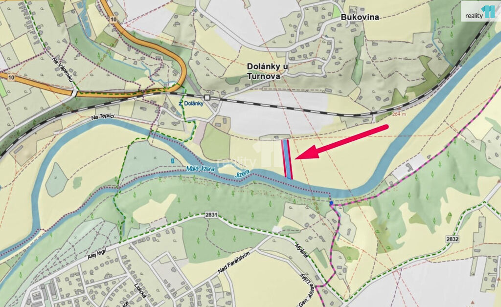 Podlouhlý cca 15 m široký pozemek ohraničuje z jedné strany místní komunikace a na opačném konci je přístup k řece Jizeře. O vývaziště pro loďky je vhodné požádat.