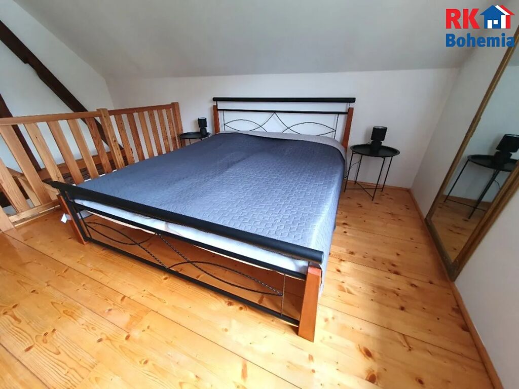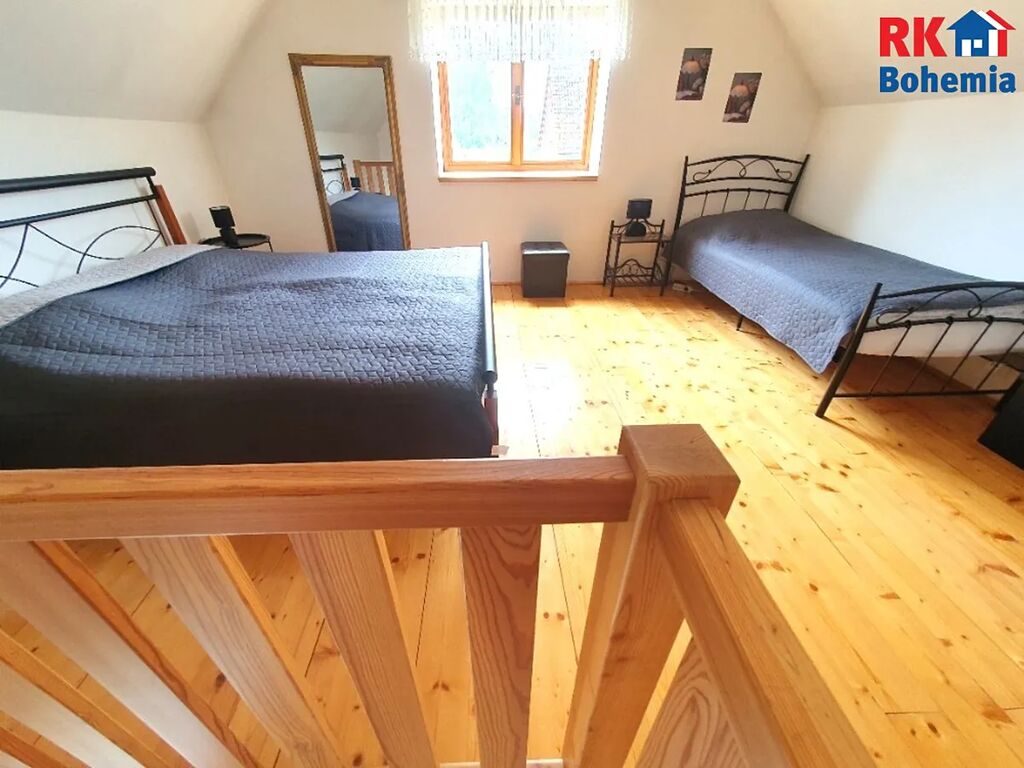V přízemí se nachází světlý a útulný obývací pokoj s krbovými kamny s výměníkem (alternativní vytápění elektrokotlem), ze kterého vede dřevěné schodiště do ložnice v patře.
