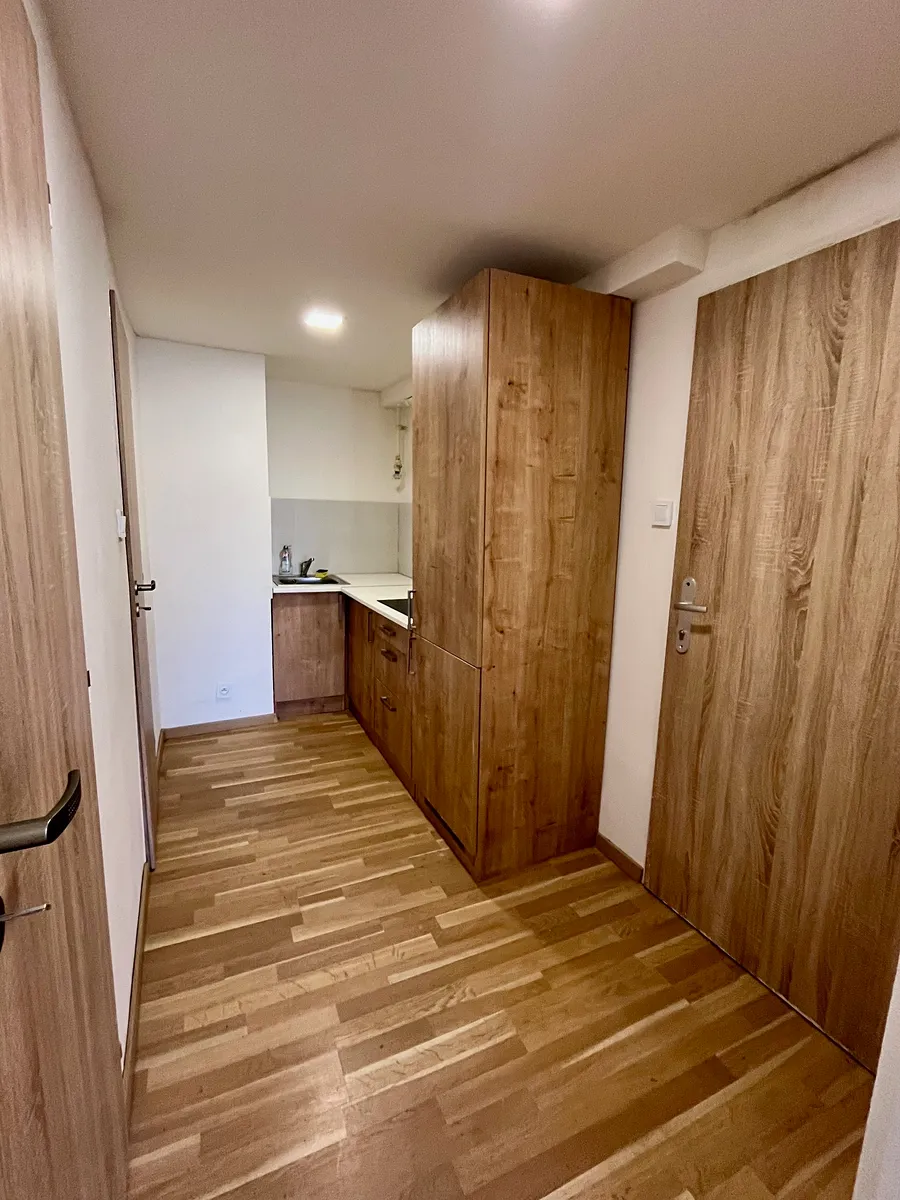 Byt je vybavený kuchyňskou linkou s varnou deskou, jinak nevybavený. Bude vymalovaný. V bytě je z obytného pokoje také praktická komora/šatna.