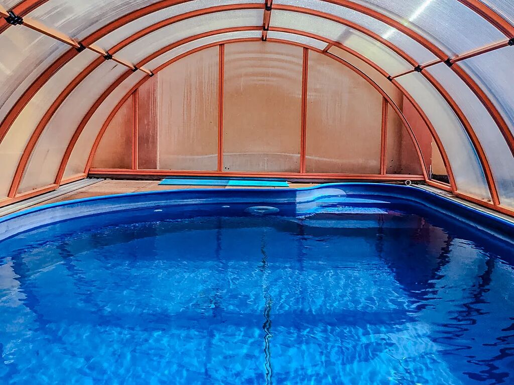 Zahrada o rozloze 385 m² poskytuje dostatek prostoru pro odpočinek i volnočasové aktivity. Najdete zde vyhřívaný krytý bazén, prostornou pergolu a zahradní kuchyni s grilem, ideální pro setkávání s přáteli a rodinou.
