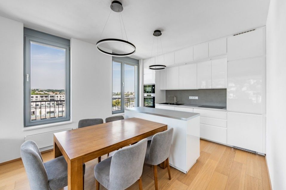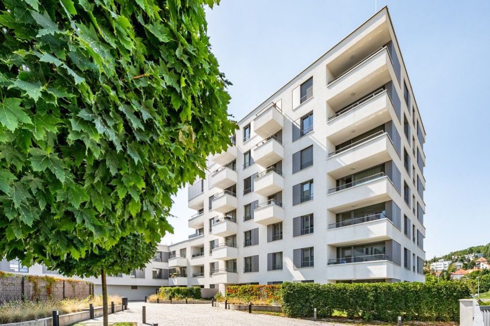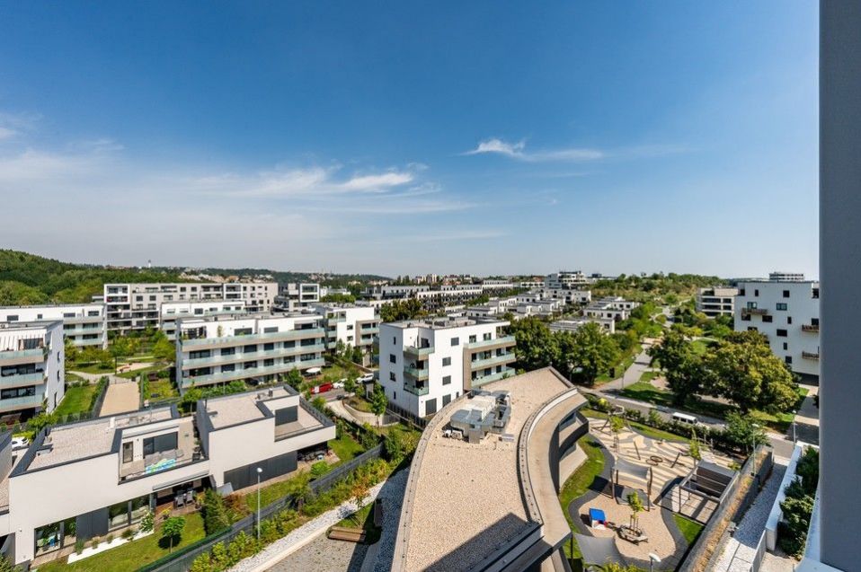 Pronájem slunného, moderního, jihozápadně orientovaného, kompletně vybaveného, klimatizovaného bytu 4+kk (109m2) s krásnými protilehlými výhledy do okolní zeleně, se dvěma balkony (9,8m2) a parkovacím místem v ceně nájmu v 8.podlaží prestižní nízkoenergetické (A) bytové rezidenci Waltrovka s nízkými provozními náklady, umístěné na Praze 5, v pěší dostupnosti stanice metra Jinonice (linka B) a oblíbeného parku Cibulka.