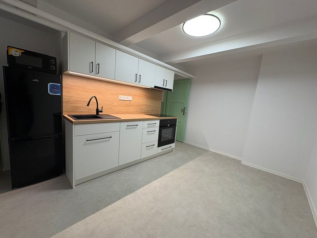 Ateliér o dispozici 1+kk je čerstvě rekonstruovaný s důrazem na moderní design a praktičnost. Kuchyňská linka je vybavena moderními vestavnými spotřebiči, včetně myčky nádobí, samostatně stojící lednice s mrazákem, elektrické trouby (není na fotkách), mikrovlnné trouby, sklokeramické varné desky a digestoře. Nově zařízená koupelna přináší komfort a eleganci každodenního užívání, je vybavena pračkou, sprchovým koutem, umyvadlem a toaletou. K bytu náleží i sklep na stejném podlaží.