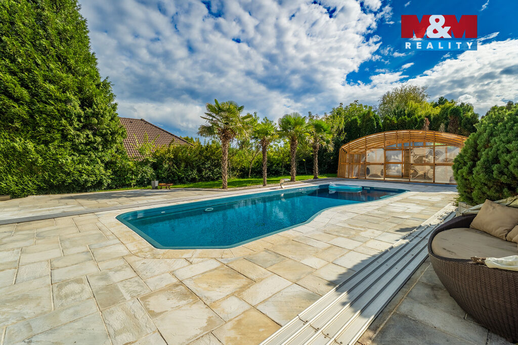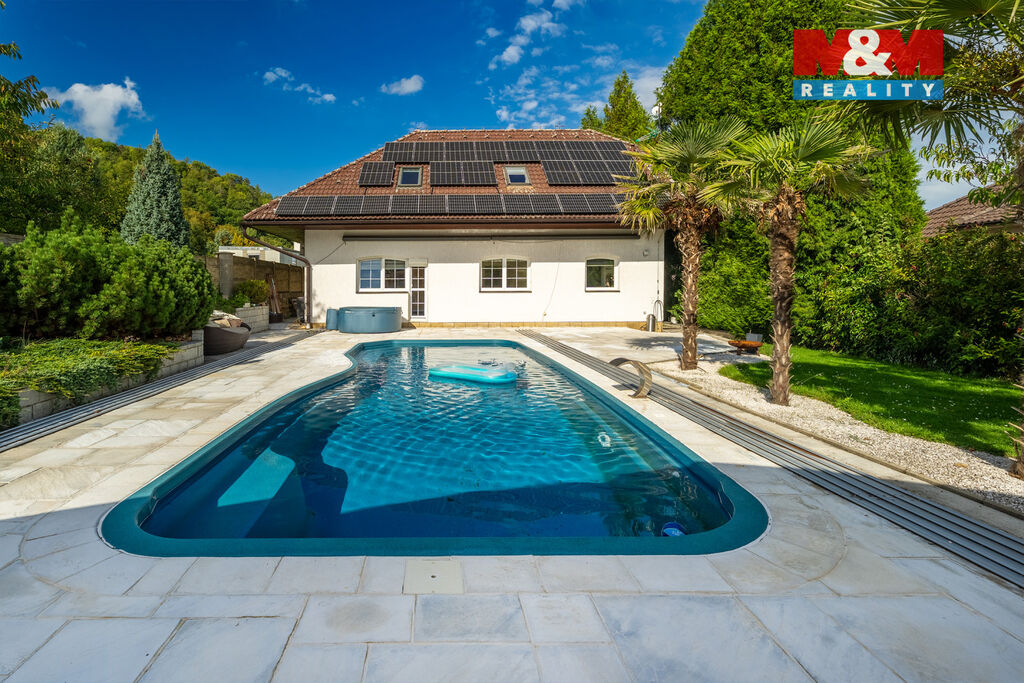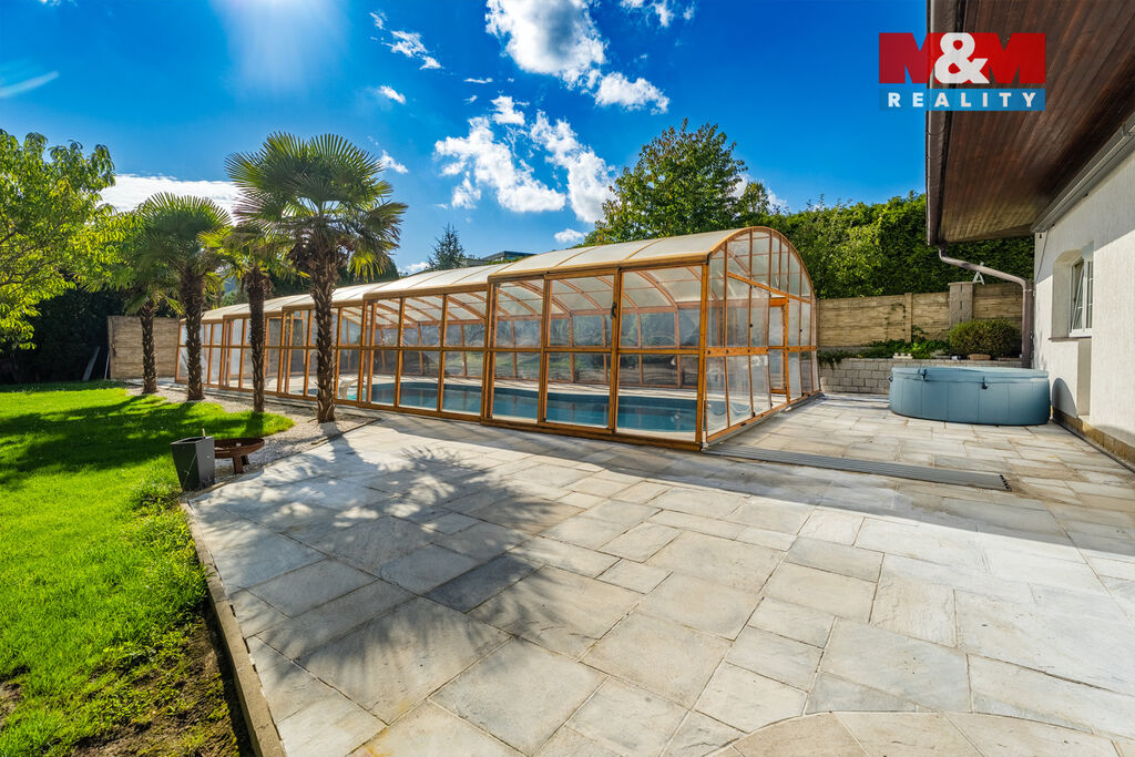 K prodeji nabízíme výjimečný rodinný dům 5+1 v Děčíně, ul. Veveří – část Václavov, který osloví náročné zájemce hledající nadstandardní bydlení s maximálním soukromím. Dům nabízí velkorysý obytný prostor s důrazem na komfort a moderní technologie. Krytý bazén 10×4 m lze díky tepelnému čerpadlu a hliníkovému zastřešení využívat celoročně, zadní terasa je osazena elektrickými roletami s LED podsvícením. V přízemí se nachází prostorný obývací pokoj s jídelnou a kuchyní se spotřebiči značek Siemens a Miele, pracovna a koupelna s designovou vanou z litého černého mramoru a sprchovým koutem EAGO. Podlahy z přírodního kamene jsou zde vyhřívané. V patře jsou tři pokoje, další komfortní koupelna se sprchou a klimatizace, která zajišťuje pohodlí v letních měsících. K zázemí náleží zasklená pergola s klimatizací, garáž a dvě samostatné dřevostavby. Bezpečnostní dveře na otisk prstu, solární elektrárna s battery boxem i celkové technické řešení podtrhují jedinečnost této nabídky v blízkosti centra