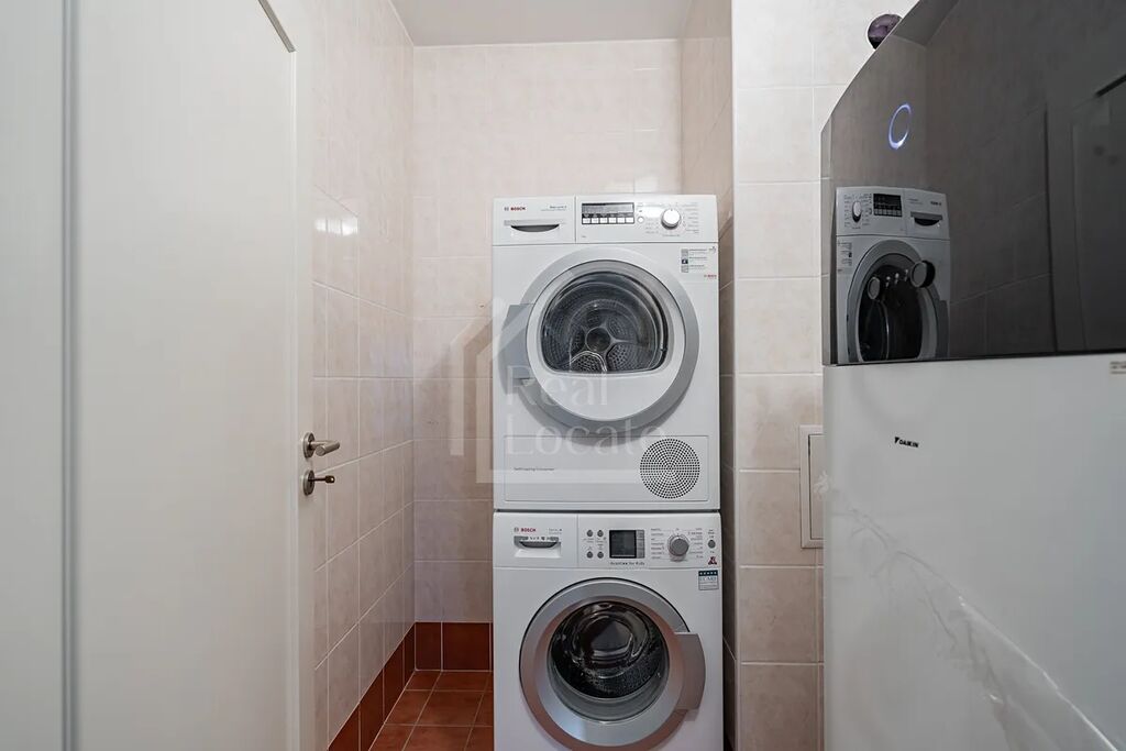 Byt je vybaven vestavnými skříněmi, vestavnou knihovnou, pračkou a sušičkou. Ve všech pokojích je rozvedená klimatizace. Podlahy jsou kombinací dlažby, dřevěné podlahy a koberce. Okna a terasy jsou orientovány na jih a východ. Internet a kabelovou TV lze připojit od Vodafone, O2 nebo T-Mobile. Dům je monitorován kamerovým systémem, hlídán ostrahou a má správce bydlícího v objektu.