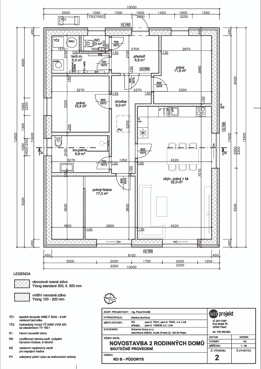 Zastavěná plocha domu je 125 m2, užitková plocha je 99,5 m2.