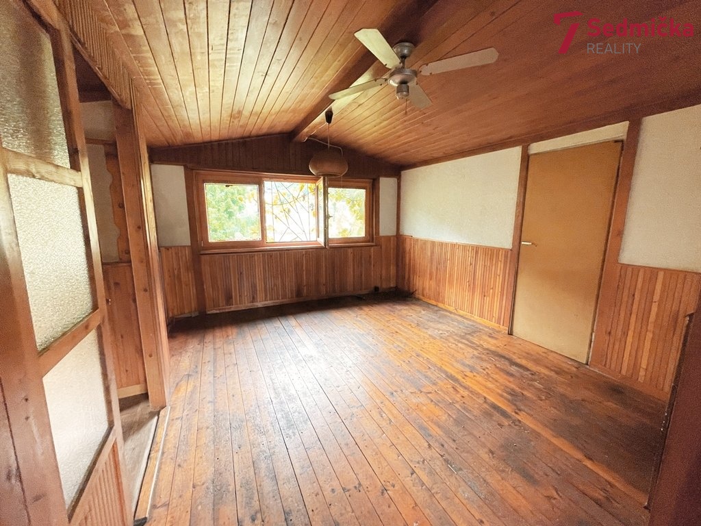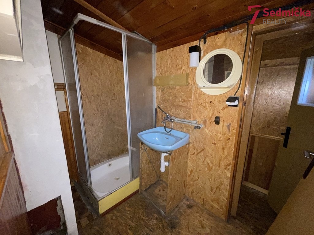 Samotná chata o velikosti 49 m² je řešena vstupem přes verandu a bezpečnostní dveře do zádveří s vestavěnou skříní. Hlavní obytný prostor je rozdělen na část s možností umístění kuchyňské linky a ústřední kamna, která tvoří dominantu interiéru. Součástí je koupelna se sprchovým koutem, samostatná toaleta a menší oddělený pokoj. V interiéru jsou palubky a již zavedené rozvody elektřiny i vody, takže objekt je obyvatelný bez nutnosti velkých zásahů, vyžaduje spíše kosmetické úpravy podle náročnosti nového majitele.