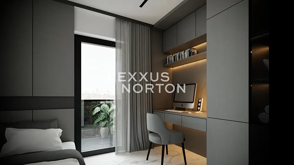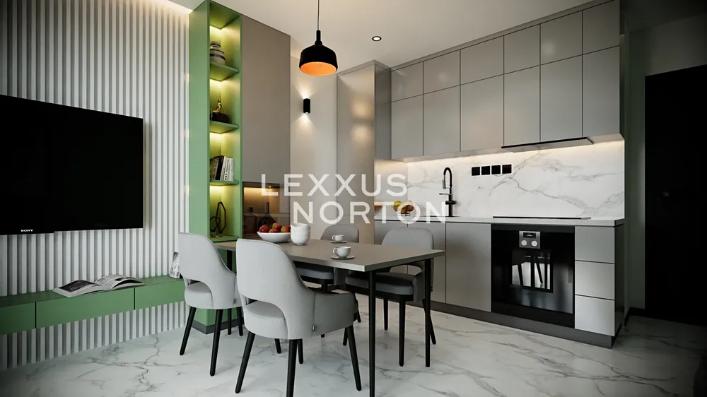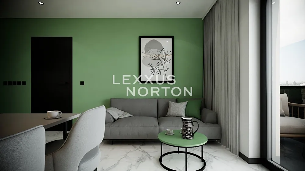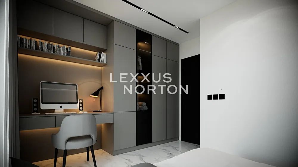 Obývací pokoj s kuchyňským koutem působí vzdušně a poskytuje příjemné místo pro relaxaci. Hlavní ložnice má dostatek prostoru pro šatní skříň a další úložné prvky. Koupelna se sprchovým koutem a WC je zpracována v nadčasovém stylu – stěrka v imitaci kamene a černé baterie Mexen Cube.