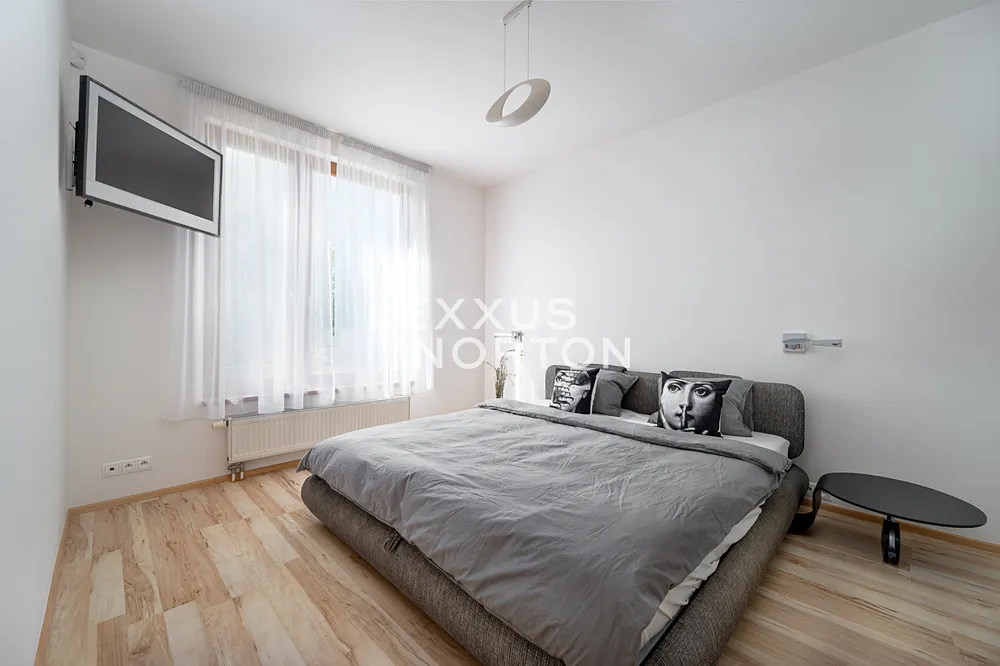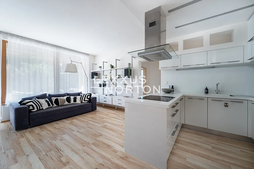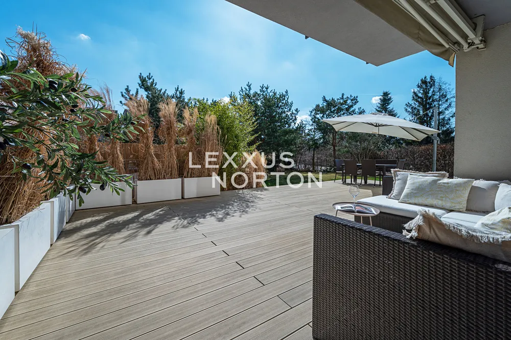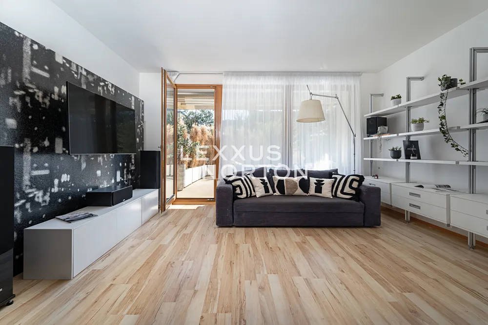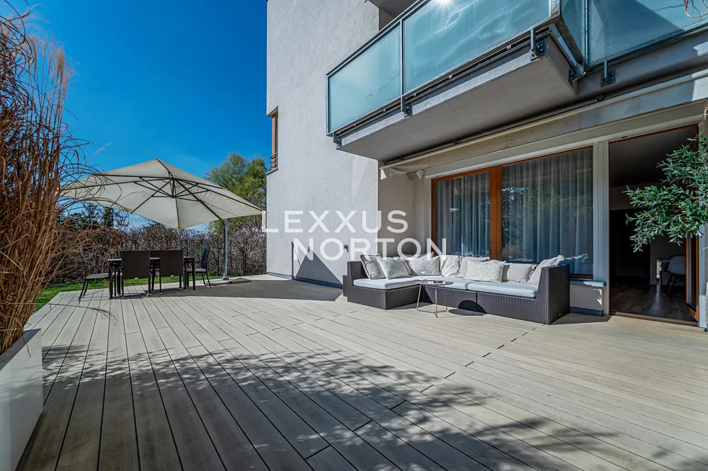 V přízemí bytového komplexu s výtahem se nachází moderně zařízený byt 3+kk k pronájmu zaujímající užitnou plochu 72,5 m2. Reprezentativní interiér bytu je tvořen vstupní halou, prostorným obývacím pokojem s moderně vybaveným kuchyňským a jídelním koutem (sporák, trouba, lednice, mrazák, myčka nádobí). Z obývacího pokoje je uzpůsoben vstup na krásnou terasu s markýzou (50 m2) a udržovanou zahradu (450 m2) s automatickým zavlažováním. Dále 2 prostorné ložnice s úložnými prostory, moderní koupelna s vanou a samostatná toaleta. Součástí vybavení je pračka, sušička, alarm, vestavěné skříně a zahradní nábytek. K domu náleží sklep o velikosti 1,5 m2, garážové parkovací stání a jedno nekryté venkovní parkovací stání.