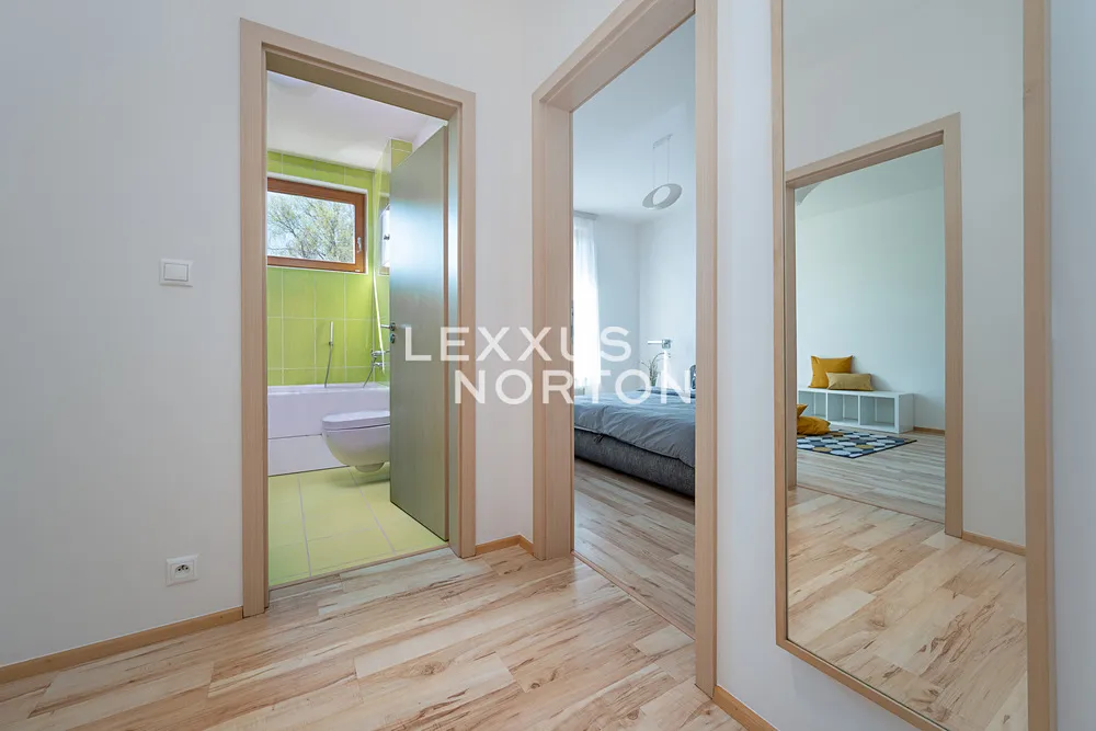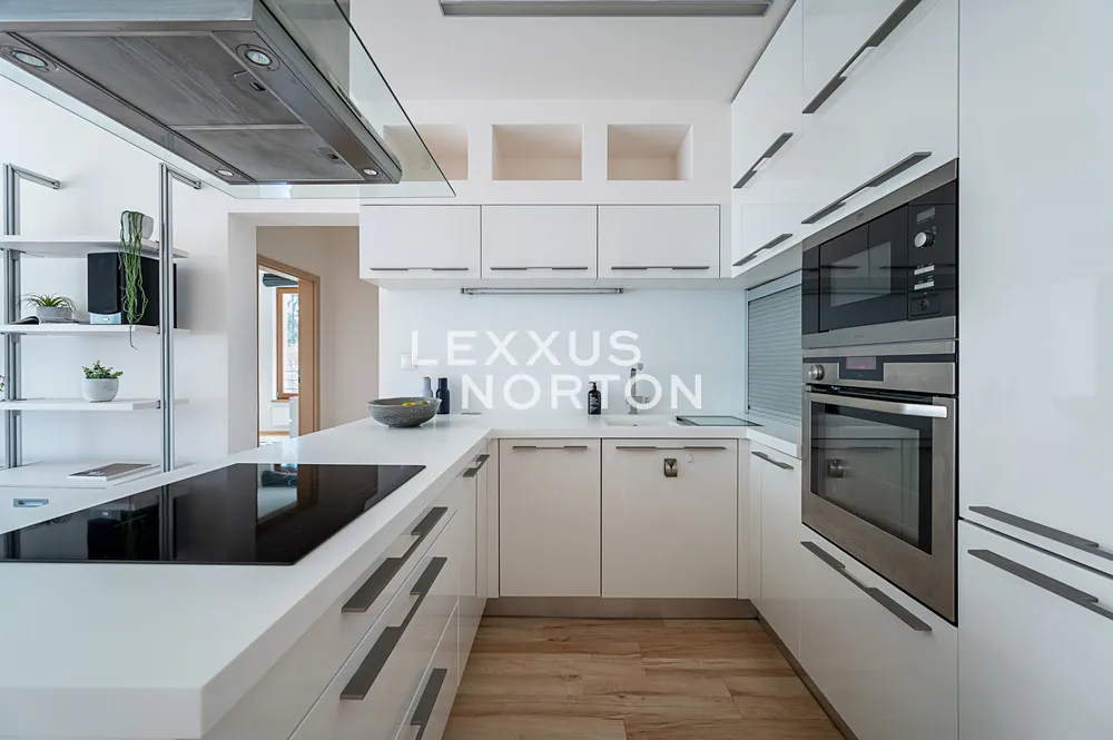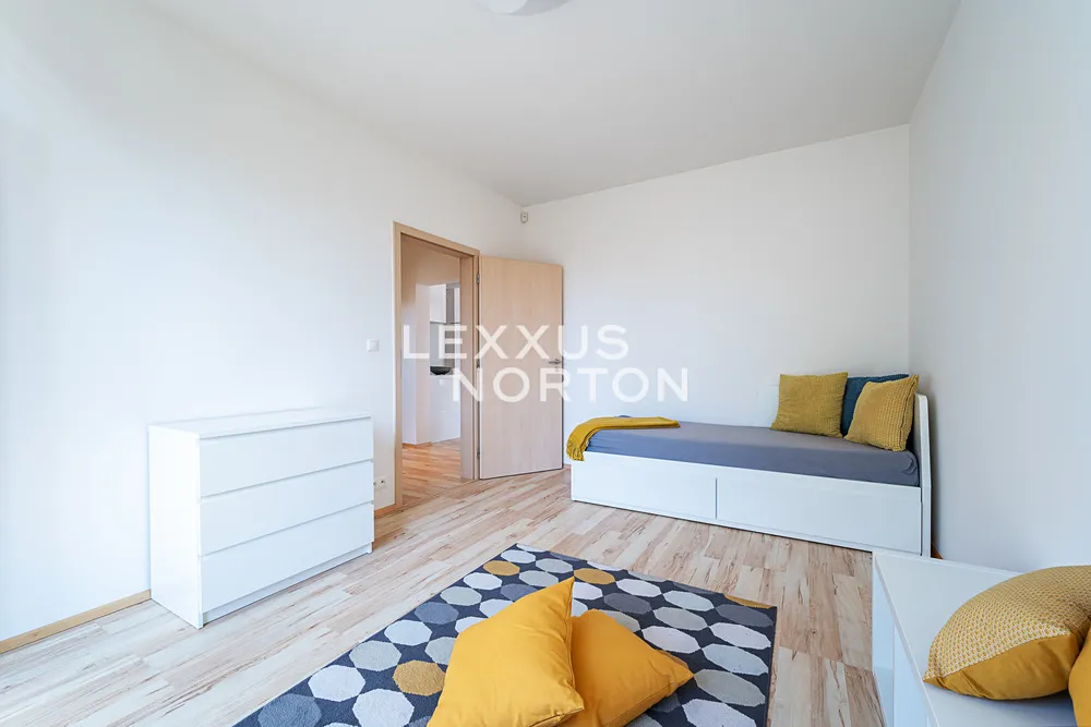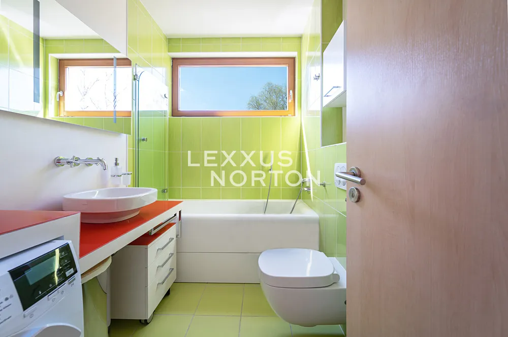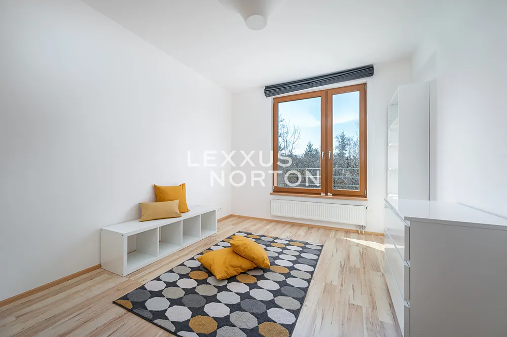 V přízemí bytového komplexu s výtahem se nachází moderně zařízený byt 3+kk k pronájmu zaujímající užitnou plochu 72,5 m2. Reprezentativní interiér bytu je tvořen vstupní halou, prostorným obývacím pokojem s moderně vybaveným kuchyňským a jídelním koutem (sporák, trouba, lednice, mrazák, myčka nádobí). Z obývacího pokoje je uzpůsoben vstup na krásnou terasu s markýzou (50 m2) a udržovanou zahradu (450 m2) s automatickým zavlažováním. Dále 2 prostorné ložnice s úložnými prostory, moderní koupelna s vanou a samostatná toaleta. Součástí vybavení je pračka, sušička, alarm, vestavěné skříně a zahradní nábytek. K domu náleží sklep o velikosti 1,5 m2, garážové parkovací stání a jedno nekryté venkovní parkovací stání.