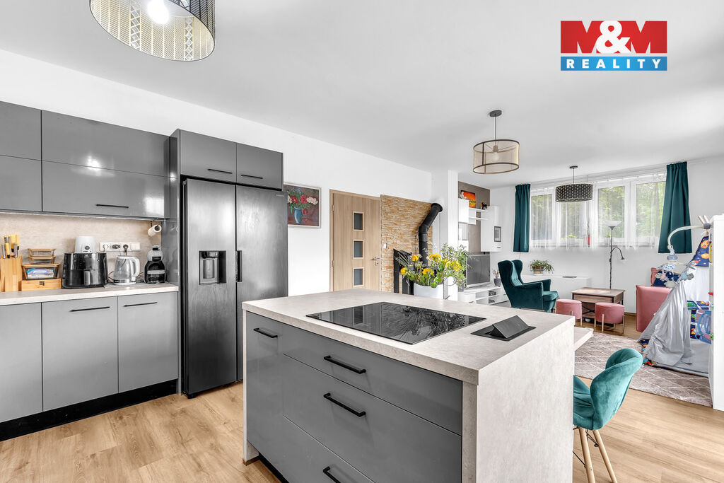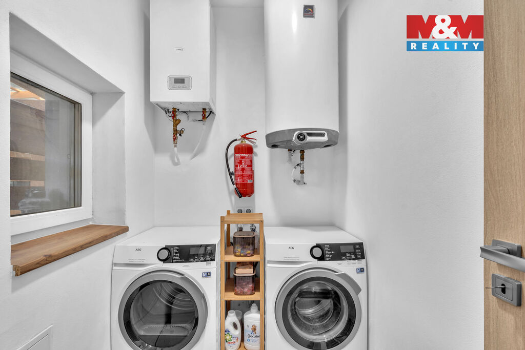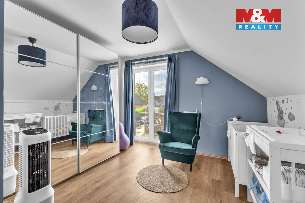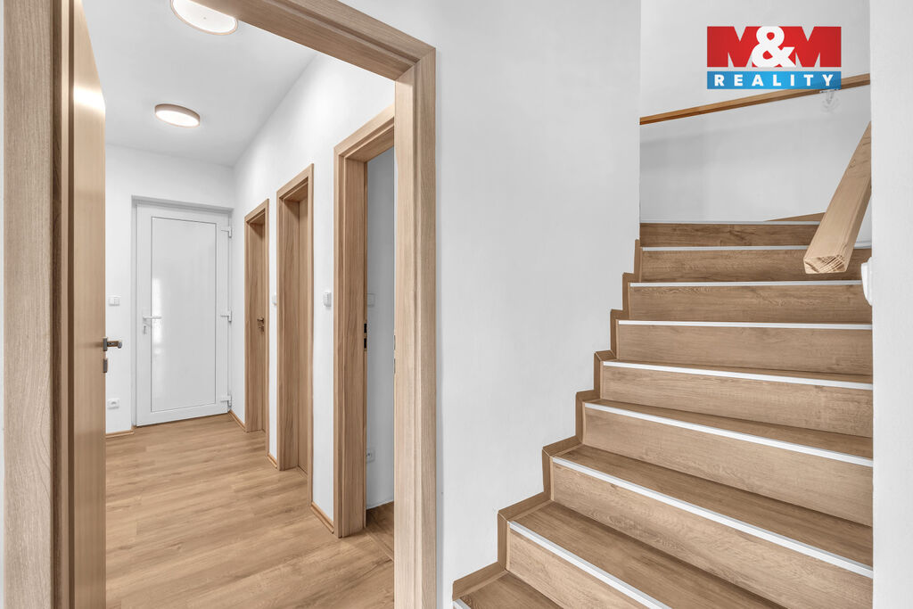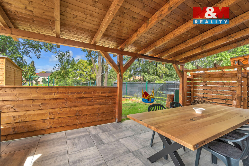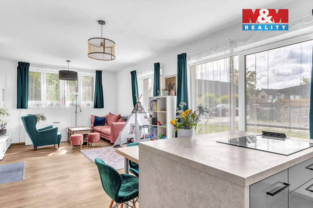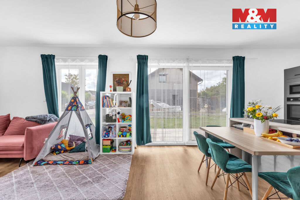 Nabízíme k prodeji moderní rodinný dům v klidné části obce Vykáň. Jedná se o rohovou část řadového dvoupodlažního domu, kolaudovaného v roce 2023. Dispozice 4+kk zahrnuje prostorný obývací pokoj s kuchyňským koutem, krbovými kamny a přímým vstupem na krytou terasu 28 m². V přízemí dále najdete chodbu, komoru, samostatné WC a technickou místnost. V patře se nachází tři ložnice, šatna a koupelna s bidetem, vanou, dvěma umyvadly a sprchovým koutem. Nad celým domem je pochozí půdní prostor, který slouží jako praktické úložné místo. Součástí pozemku 452 m² je nekrytá terasa 10 m², zahradní domek 9 m² s přístřeškem 9 m², dřevník u terasy a sklad 6 m² s vchodem vedle hlavního vstupu. Celý pozemek je oplocen a nabízí dostatek soukromí. Neváhejte a přijďte si prohlédnout tuto novostavbu, která čeká na svého nového majitele! Na návsi najdete úřad, obchod, autobusové spojení, a v budoucnu zde vznikne i školka. Autem je veškerá občanská vybavenost dostupná do 5 minut.