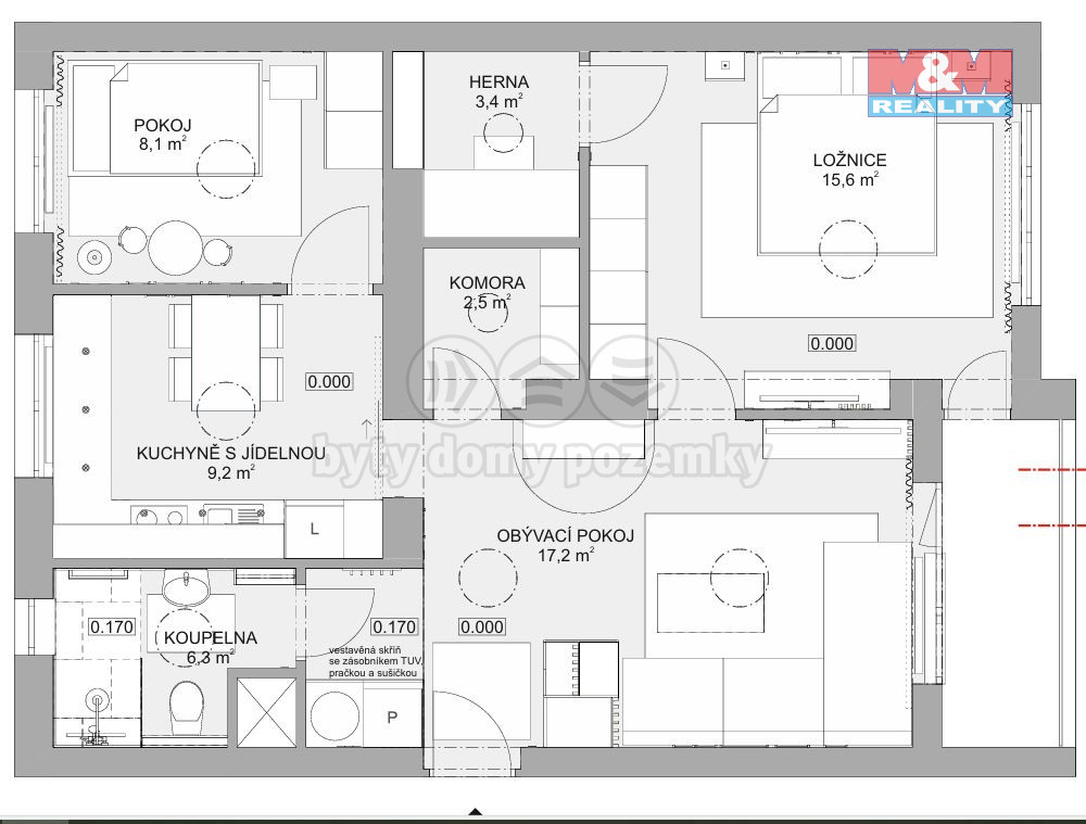 Atypický byt má chodbu spojenou s obytným prostorem, odkud vejdeme buď do kuchyně, ložnice, komory anebo do koupelny s WC. Z kuchyně se pak průchodem dostaneme do ložnice druhé. Ta první je větší a ještě navíc má svoji šatnu. Dále je tu lodžie, na kterou se dostaneme jak z obývacího pokoje, tak z velké ložnice.