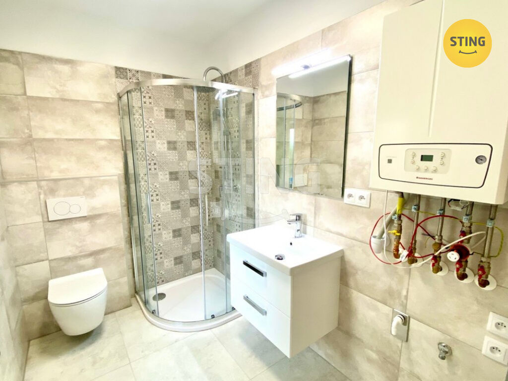 Dispozice bytu zahrnuje zádveří s úložným prostorem, moderní kuchyňskou linku vybavenou vestavnou myčkou, praktickou spižírnu, prostorný obývací pokoj, ložnici a koupelnu se sprchovým koutem. Vytápění je zajištěno vlastním plynovým kondenzačním kotlem, což zaručuje efektivní a úsporný provoz.
