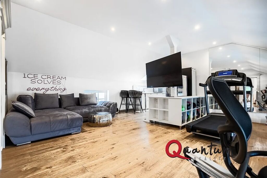 Ložnice s vlastní koupelnou, ložnice, 2x koupelna, šatna, velká podkrovní místnost s kuchyňským koutem aktuálně využívaná jako fitness (snadná možnost změny na další ložnici se šatnou a koupelnou, případně nezávislého 2KK se šatnou a koupelnou k bydlení pro hosty či rodiče apod.)
