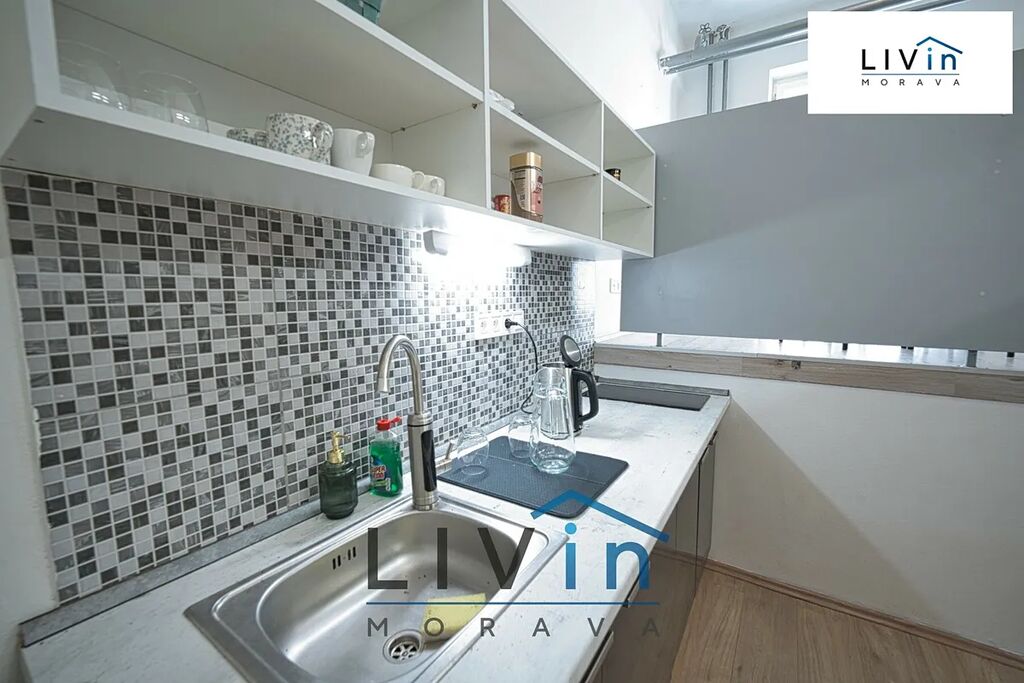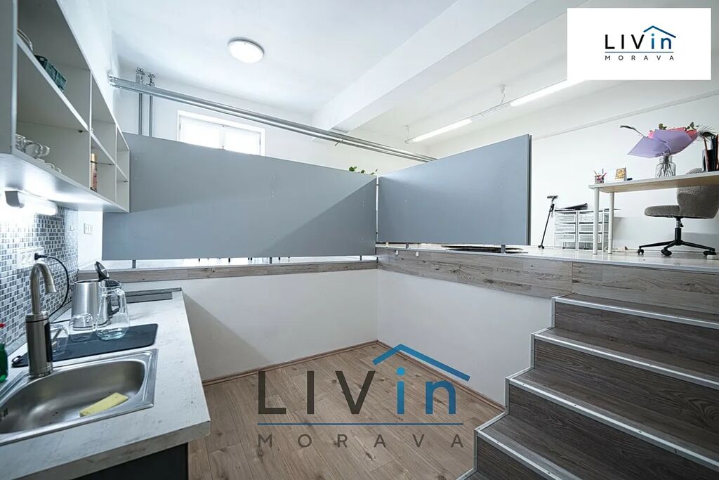 V místnosti je prostorově oddělená kuchyňská část. Ve vyvýšené části je zbytek kanceláře s dostatkem místa pro jednací stůl, pracovní stůl, pohovku i úložné prostory. Nová kuchyňská linka zahrnuje dřez a indukční varnou desku. Kancelář je nově zrekonstruovaná, na podlaze je položena plovoucí podlaha. Toalety jsou na patře ve společných prostorách budovy.