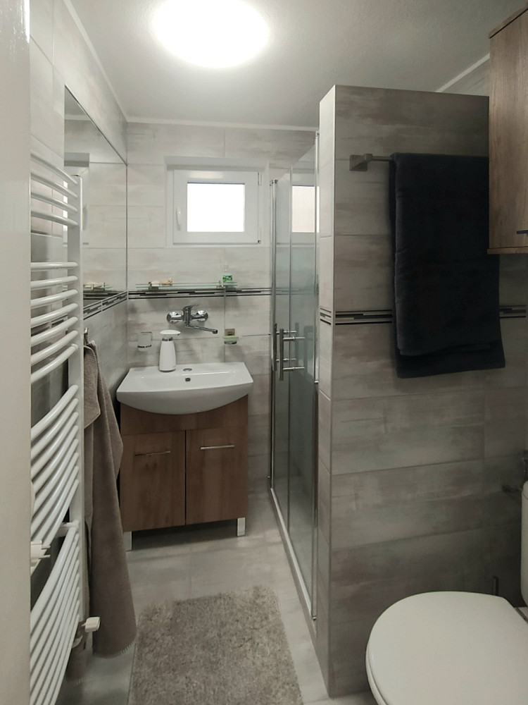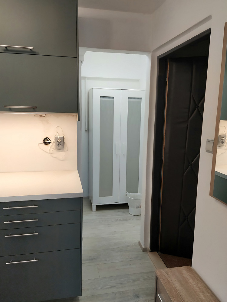 Dispozice – pokoj s odděleným kuchyňským koutem, koupelna se sprchovým koutem společně s WC, zádveří.