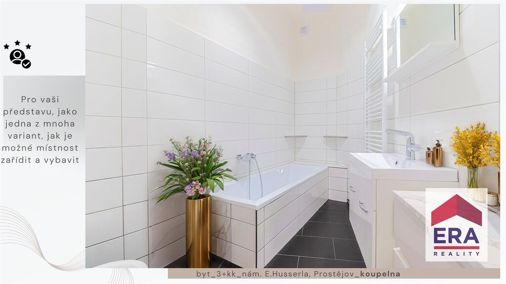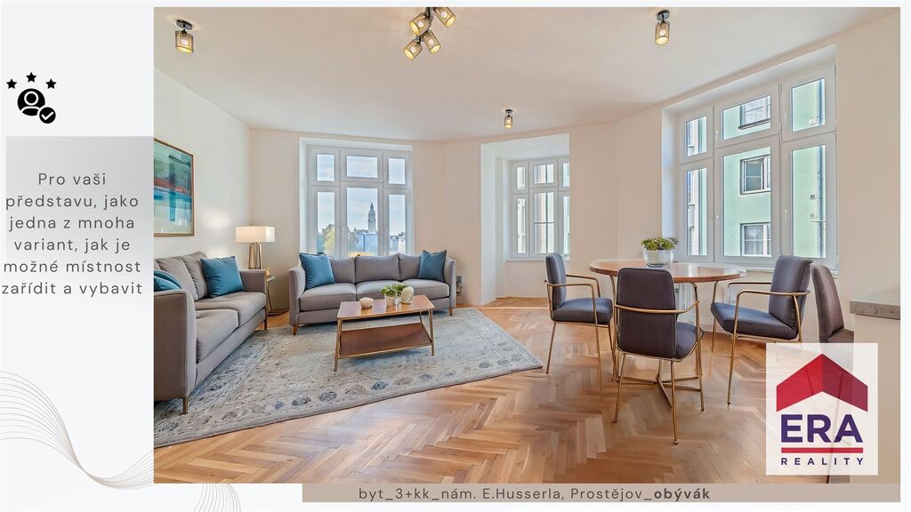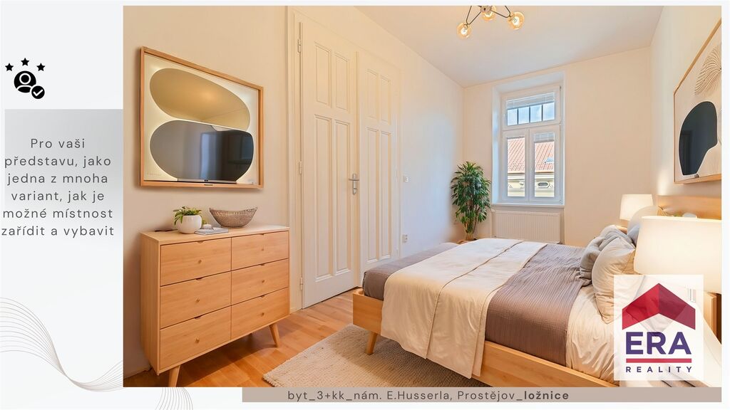 K pronájmu pěkný, velmi prostorný byt s dispozicí 3+1, který se nachází ve 2. patře (3.NP) cihlového domu pří,o v centru města Prostějova nám. E. Husserla.