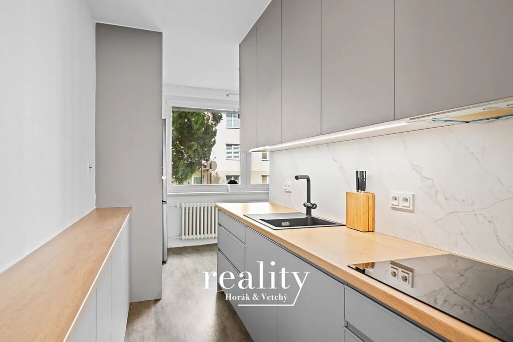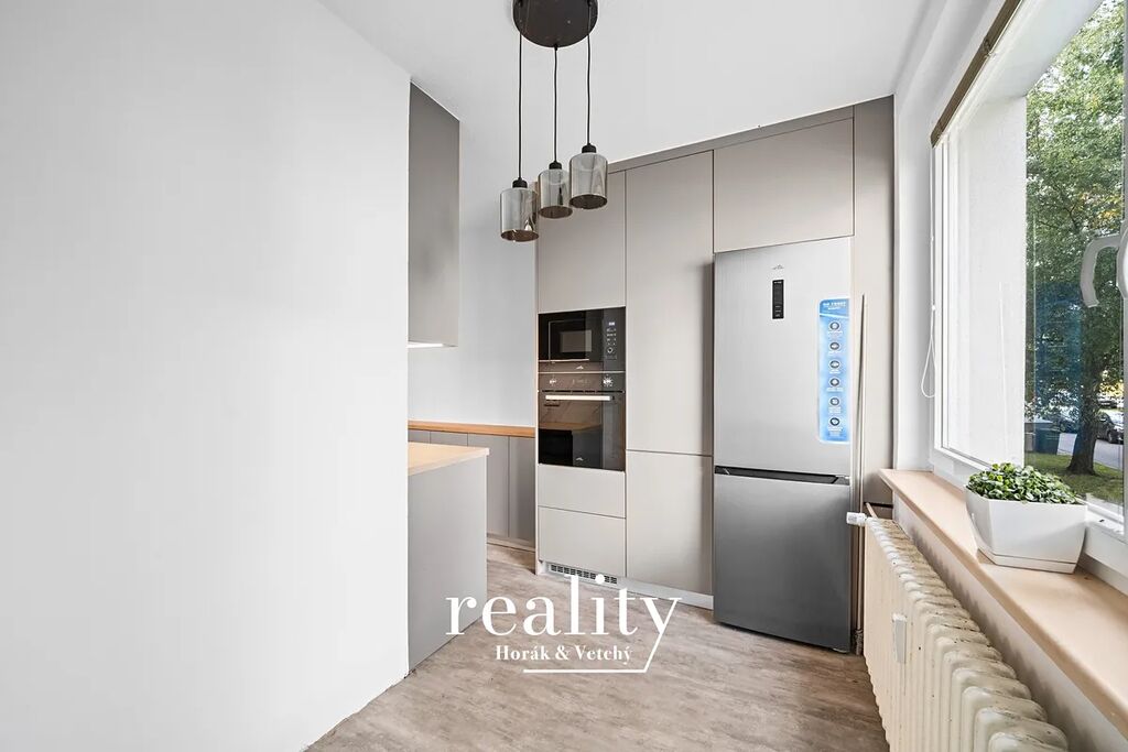Za ním je vstup do kuchyně s jídelním koutem (12,3m2), která byla zrekonstruována a je vybavena linkou na míru.