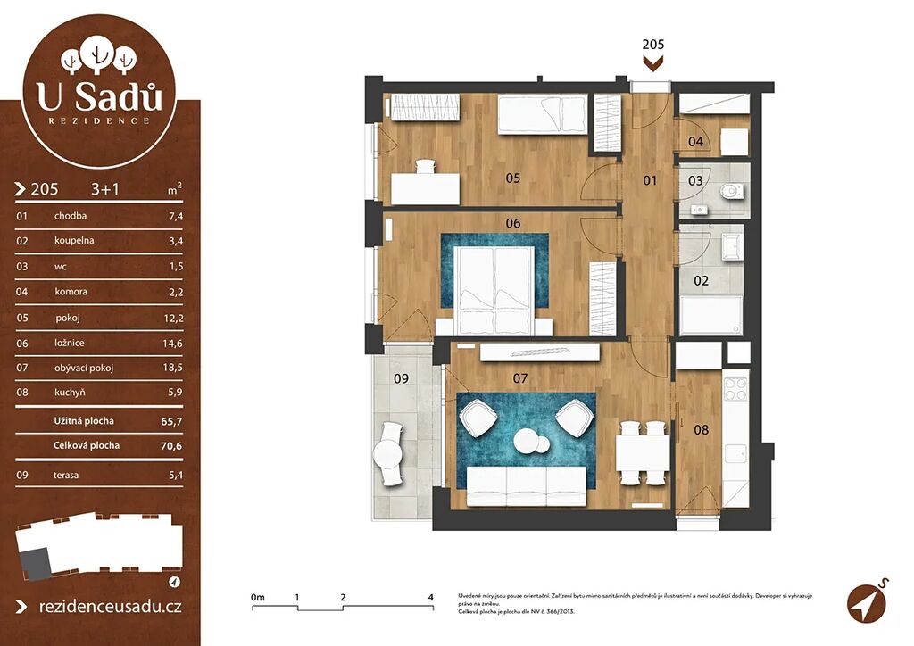 Nabízíme velkorysý byt 3+kk o celkové výměře 70,6 m2, který je umístěn v 2. patře budovy. Součástí bytu je navíc i nádherná terasa o celkové výměře 5,6 m2, která je natočená na východní stranu, tudíž se můžete těšit na romantické chvíle při západu slunce.