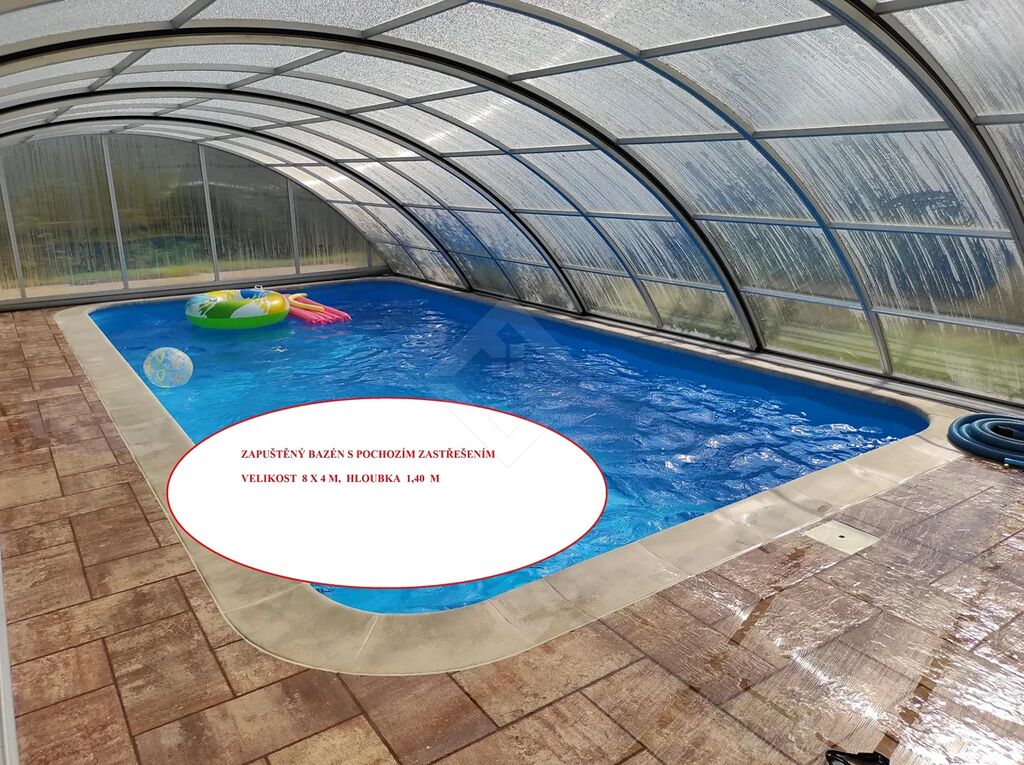 Doplňky u domu: vjezdová ručně ovládaná vrata, dřevěný dětský domek v rohu zahrady, malé dětské hřiště, 2x polykarbonátové skleníky, dřevník, vyvýšené záhony, v zemi 8 m3 zapuštěná nádrž na dešťovou vodu s rozvody po celé zahradě s 5ti kohoutky, příslušenství k bazénu v zemi v betonové šachtě přímo u bazénu.