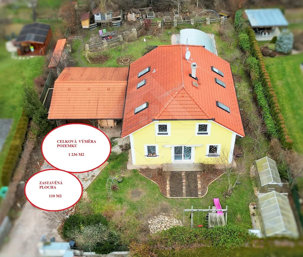 Jedná se patrový RD, zastavěná plocha 110m2, celková obytná plocha 175 m2 – v přízemí 90 m2, - v patře 85 m2, terasa se zastřešenou pergolou u domu 30 m2, pochozí půdní prostor nad celým domem pro úložné účely.