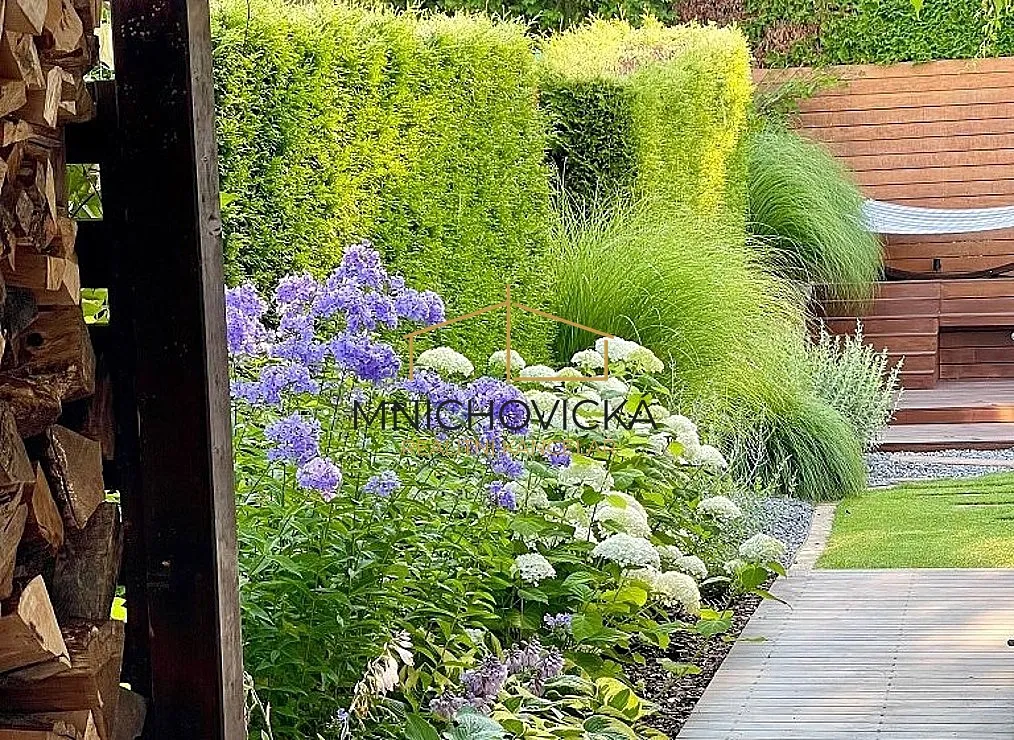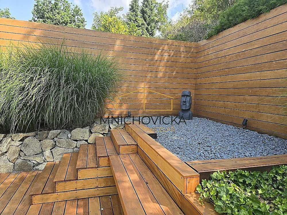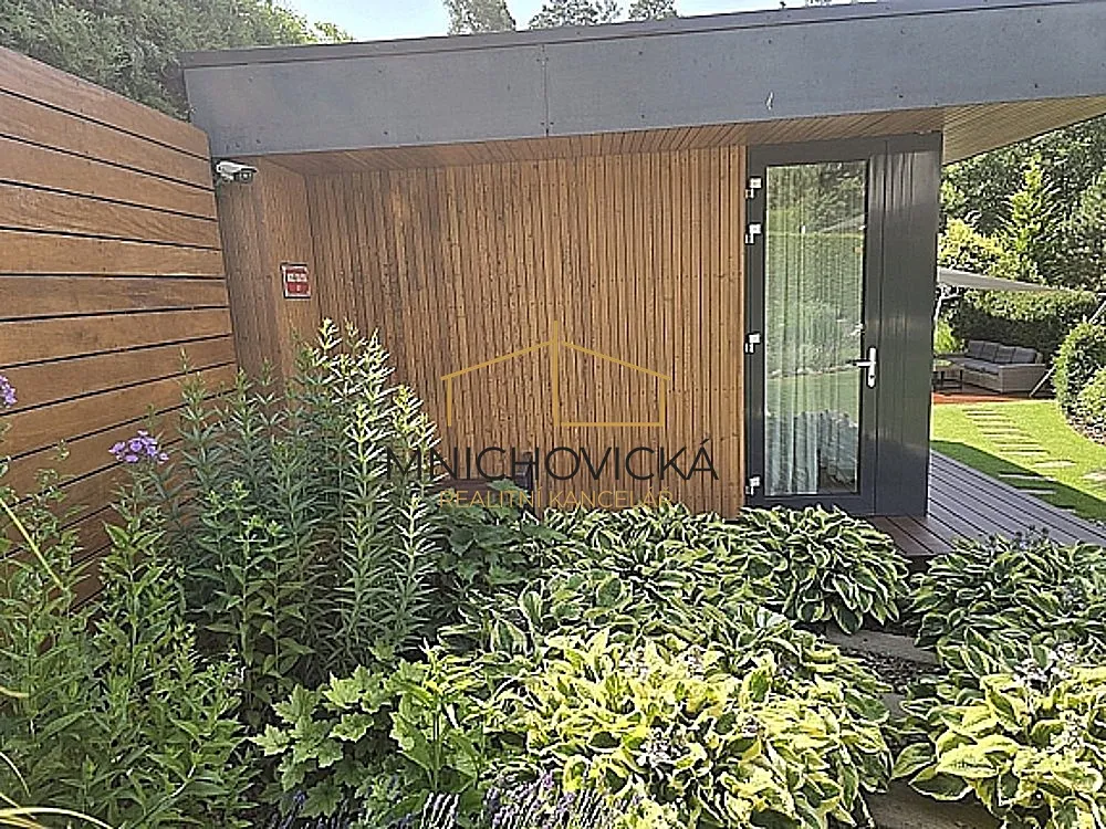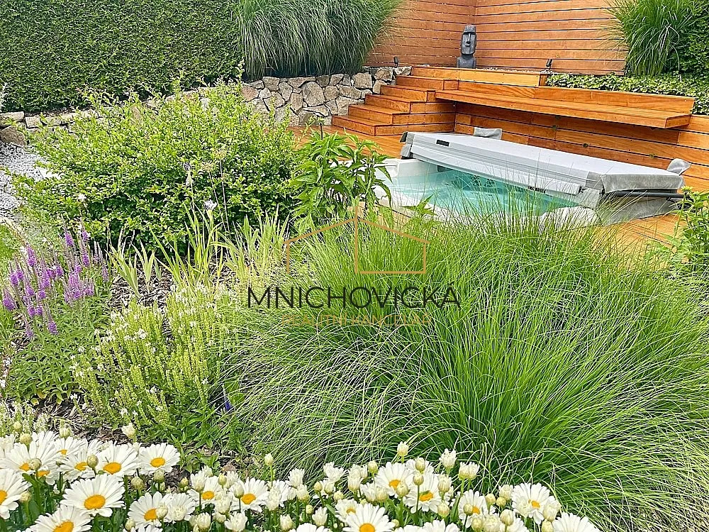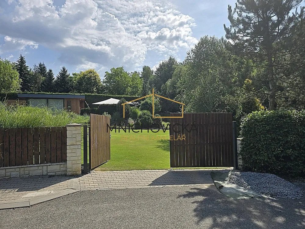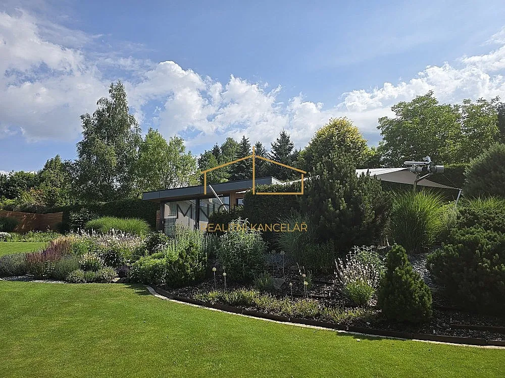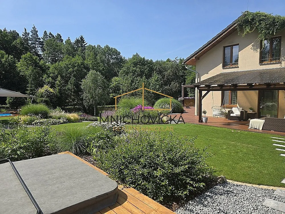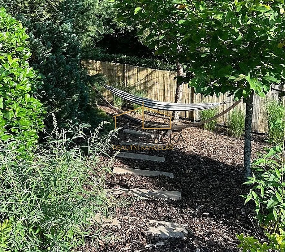 Dům stojí v krásné a udržované zahradě o výměře cca 1450 m2, se vzrostlým porostem okolo oplocení, chránícím soukromí majitelů od sousedních pozemků.