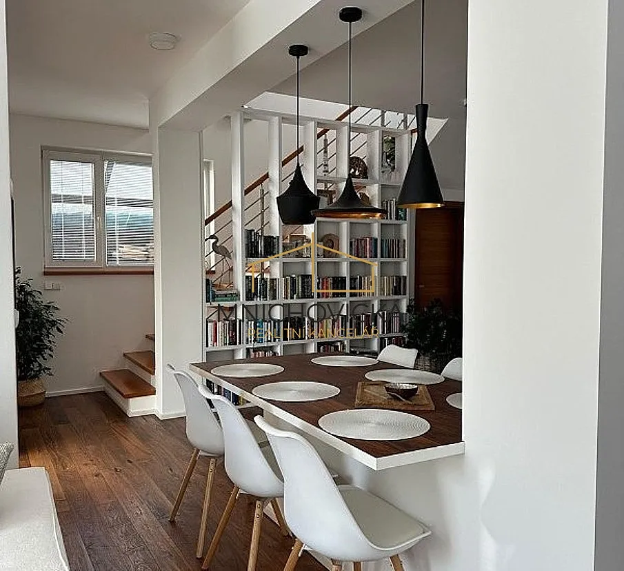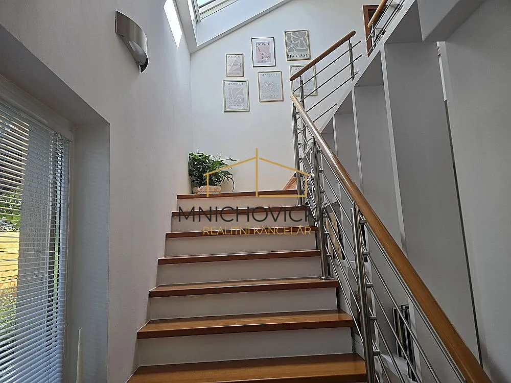 Celé přízemí je otevřené, světlé, dispozičně velmi zajímavě řešené, s výstupy na prostornou terasu 60 m2, zhotovenou z velmi tvrdého, tropického dřeva Garapa. V obývacím pokoji nechybí moderní krb, vytápění domu zajišťuje plynový kotel s napojením v přízemí na podlahové vytápění, v patře na radiátory, centrálně ovládané prostřednictvím aplikace např. přes mobilní telefon.