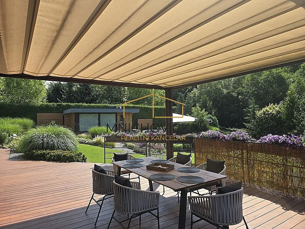 V létě se dá sedět na velké terase, s elektricky ovládaným stíněním, takže i v horku je tam příjemně. Když je chladno, lze se naopak ohřát díky dvěma nástěnným infrazářičům.