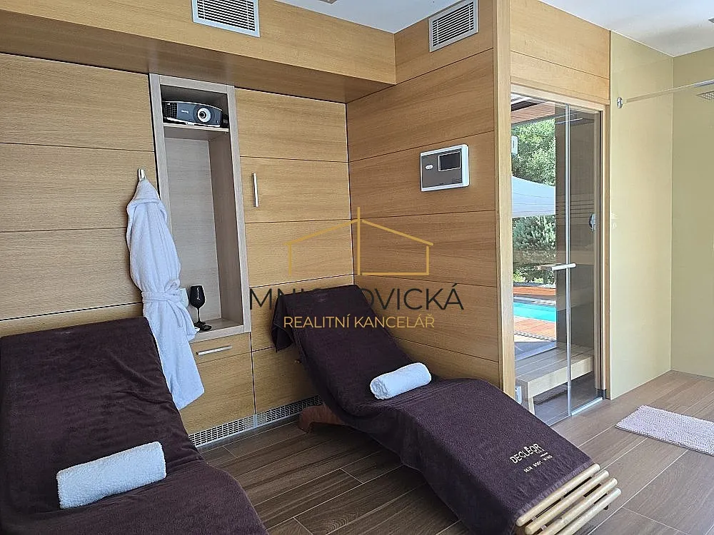 Nemovitost kromě bydlení nabízí také wellness: saunu, venkovní vířivku, venkovní vytápěný bazén 3x5 metrů s protiproudem a posuvným krytím. Vše je dobře promyšlené, aby to majitelům skutečně sloužilo, ne jen pěkně vypadalo.
