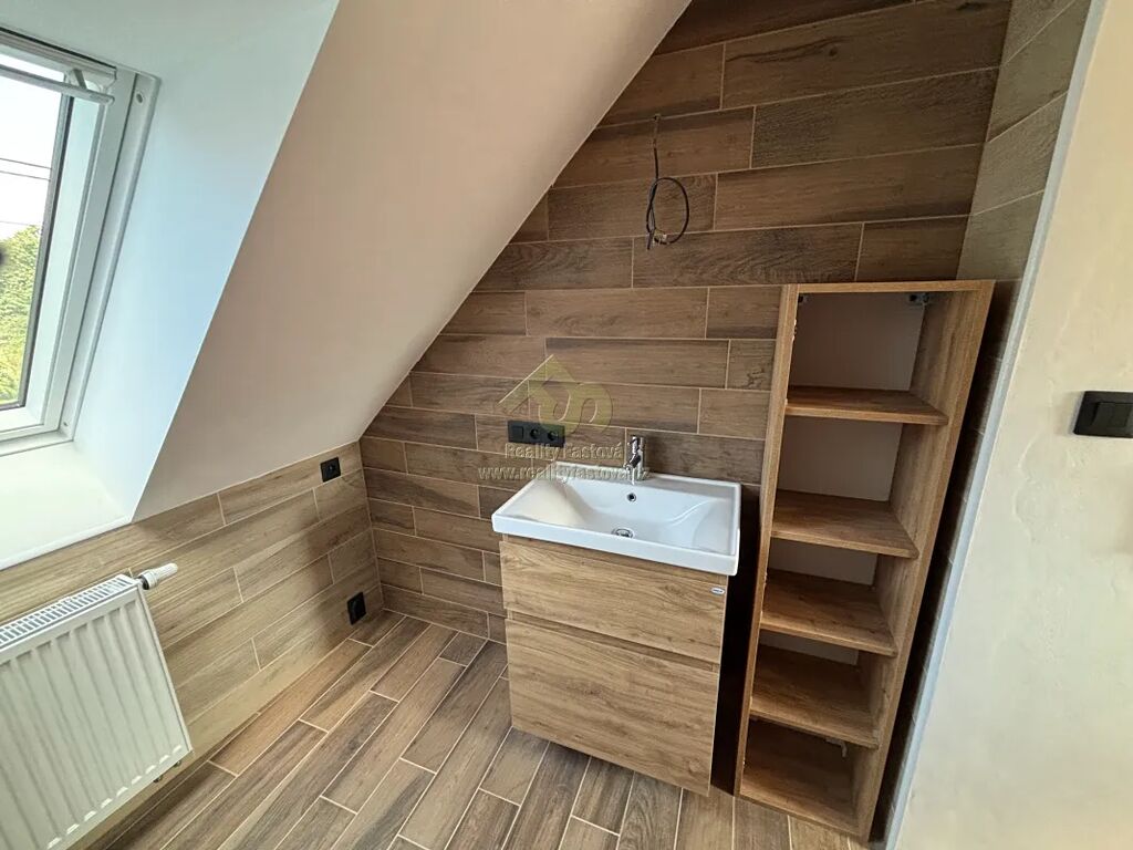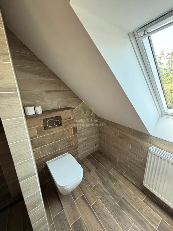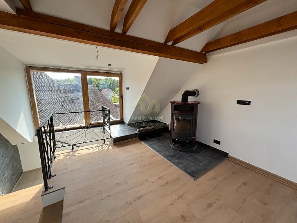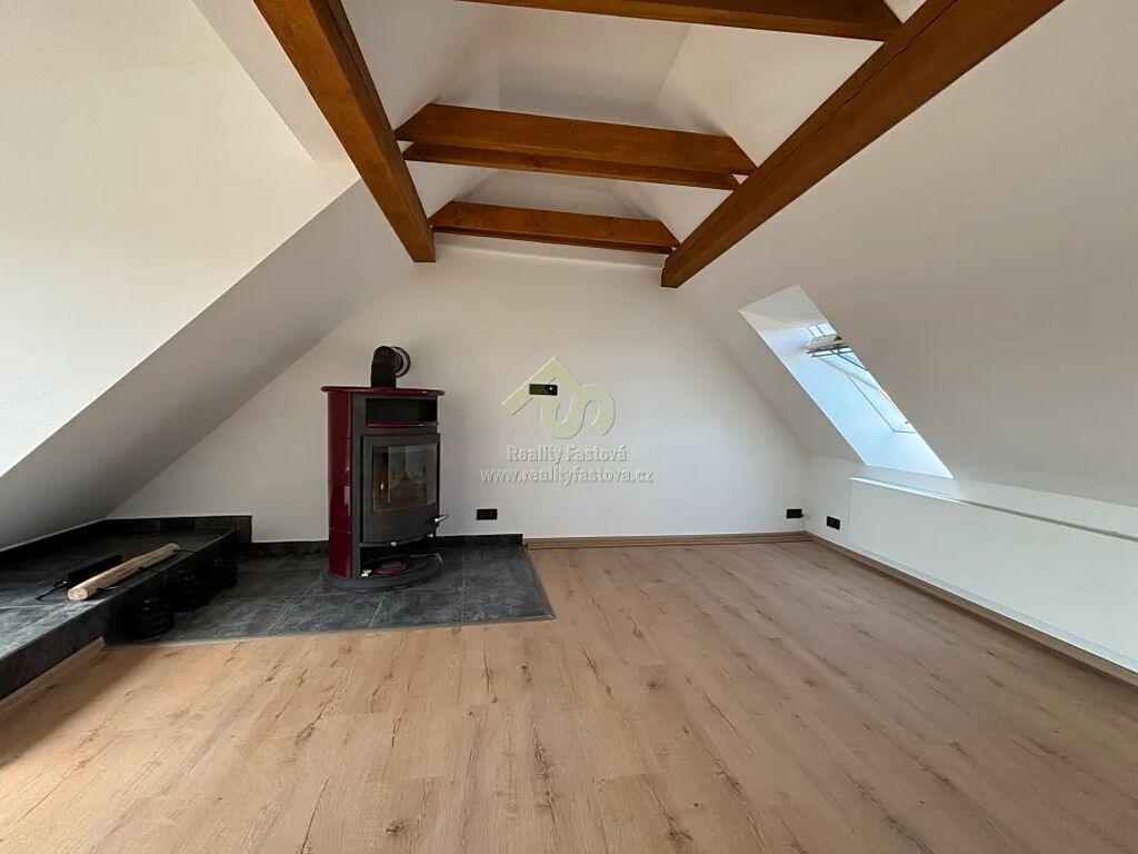 Do obytné části se vystupuje do patra po schodišti s designovým kovovým zábradlím. Otevře se před vámi krásný a prosvětlený podkrovní byt, o vel. 2+kk. Vlevo obývací pokoj s krbovými kamny, který při chladnějším počasí vykouzlí romantické večerní teplo. Uprostřed bytu je kuch.kout s vestav.spotřebiči el.sporák s troubou, digestoří a myčkou. V krásné a prostorné koupelně je vyzděný sprchový kout, umyvadlo a toaleta. Vedle kuchyně se dále nachází samostatný pokoj.