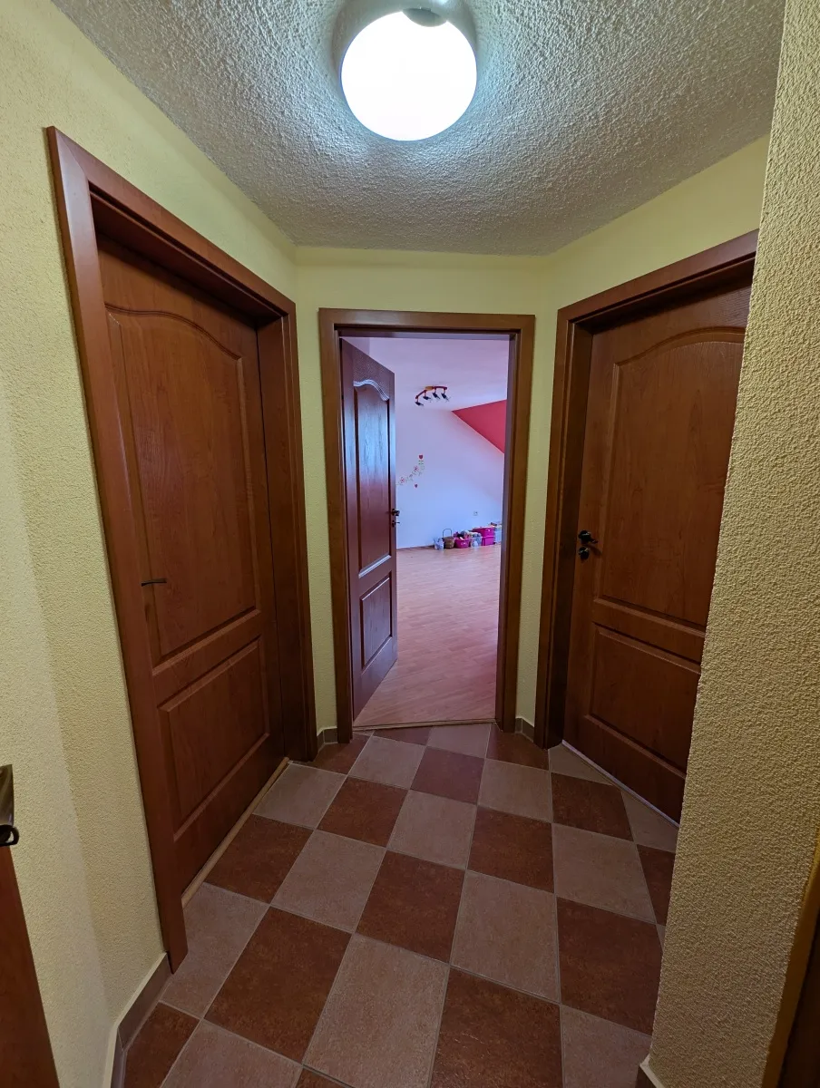 První patro: nedodělaná koupelna s toaletou, ložnice s lodžii, ložnice 2, ložnice 3.