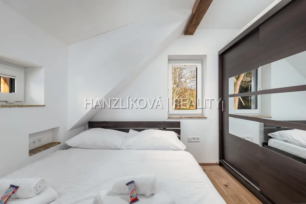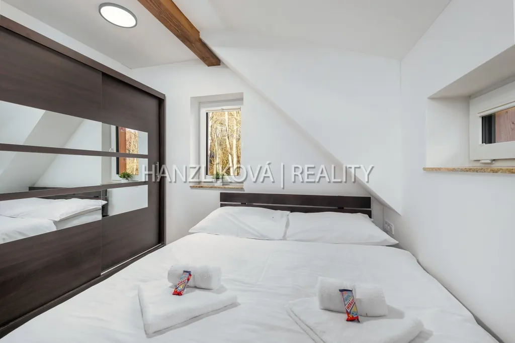 Areál je zasazený do nedotčené přírody, obklopený hlubokými lesy a nabízí naprostý klid a soukromí - ideální prostředí pro odpočinek i rodinnou rekreaci. Hranice pozemku sousedí s chráněnou krajinou oblastní a je zde stavební uzávěra. Jedinečnou atmosféru dotváří malý potůček, který se vine podél pozemku a přináší do prostředí osvěžující nádech a kouzlo horské přírody. Šum vody i zeleně v okolí dělají z tohoto místa ideální útočiště pro odpočinek, rekreaci či rodinné zázemí. Provozní náklady se pohybují kolem 6-8 tis Kč měsíčně. Nemovitost je možné využívat celoročně - ať už jako rodinné rekreační zázemí nebo jako investici s možností pronájmu. Možnost zajištění přes agenturu včetně zajištění úklidu.