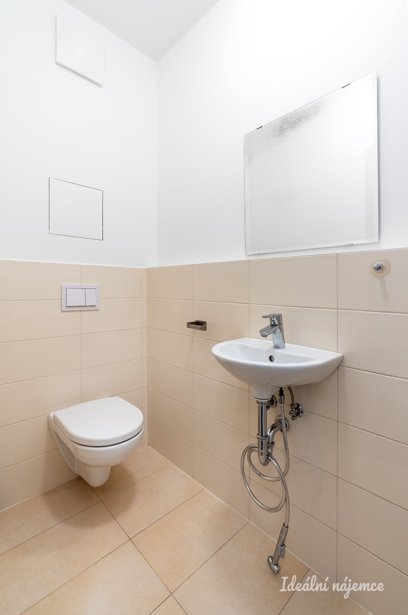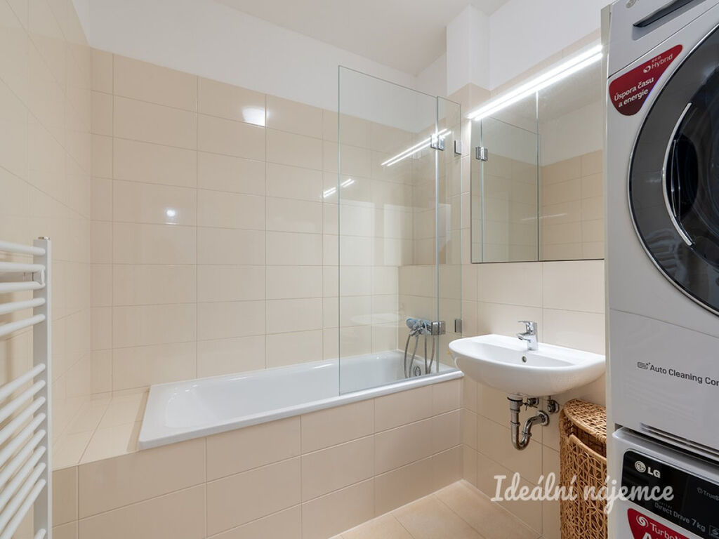 Byt je nabízen částečně vybavený, což dává novému nájemníkovi možnost doladit si interiér podle vlastního vkusu. Moderní kuchyň je vybavena lednicí s mrazákem, elektrickou troubou, indukční varnou deskou, digestoří, myčkou a jídelním koutem. Na ni navazuje prostorný obývací pokoj, který lze zařídit například pohodlnou sedací soupravou, televizorem a dalším nábytkem.