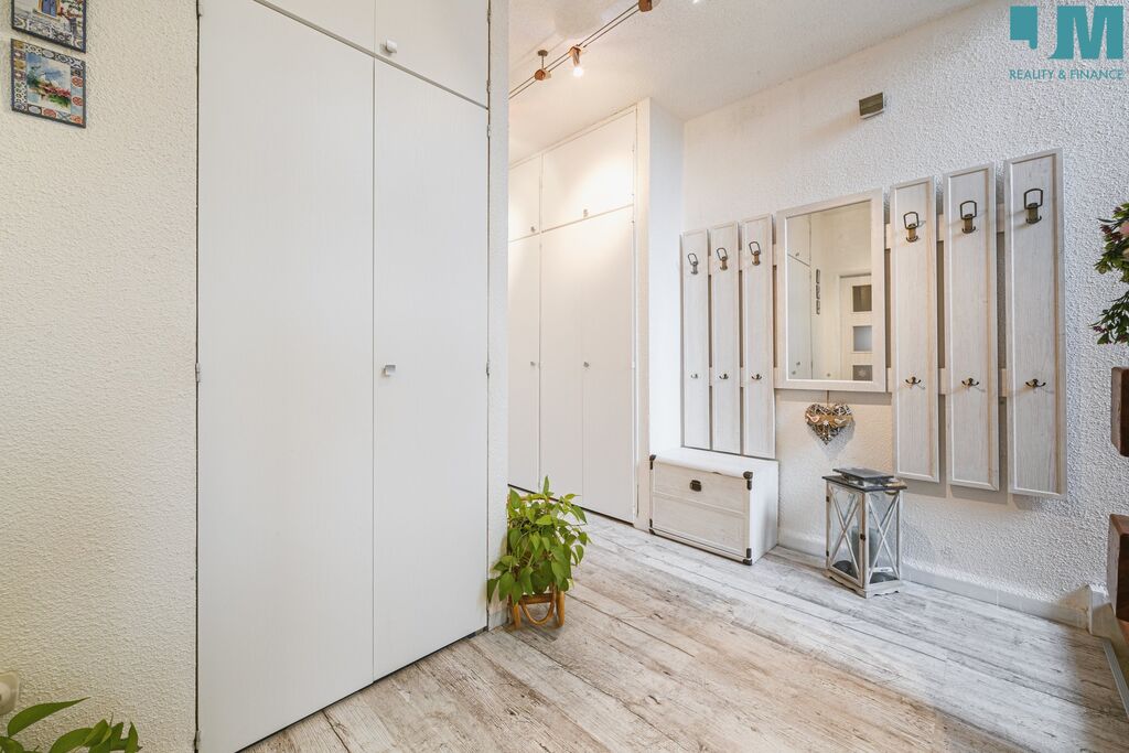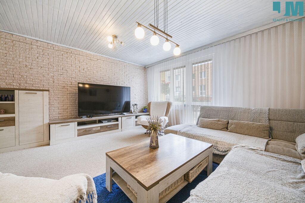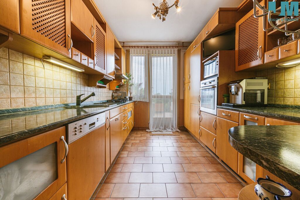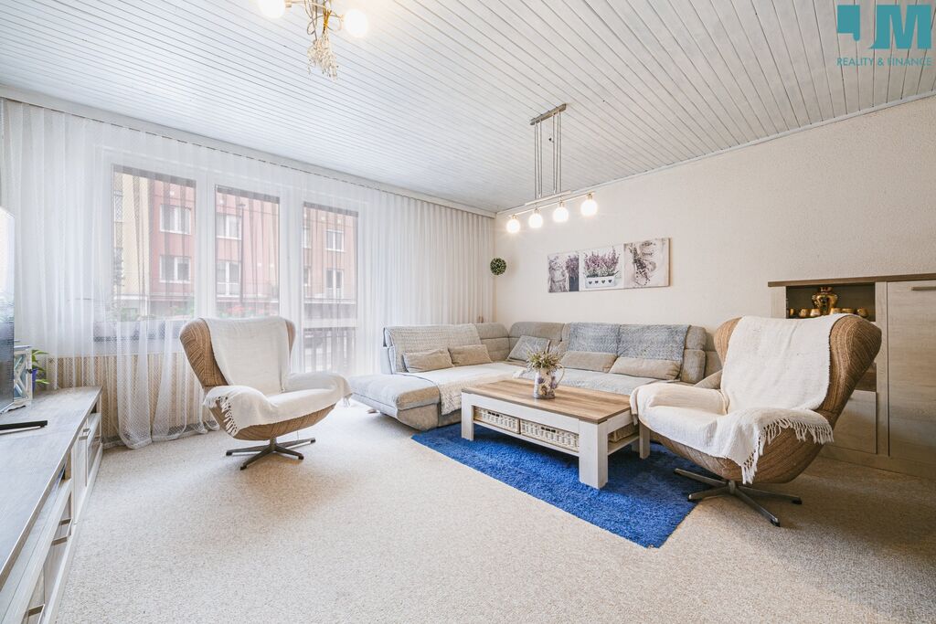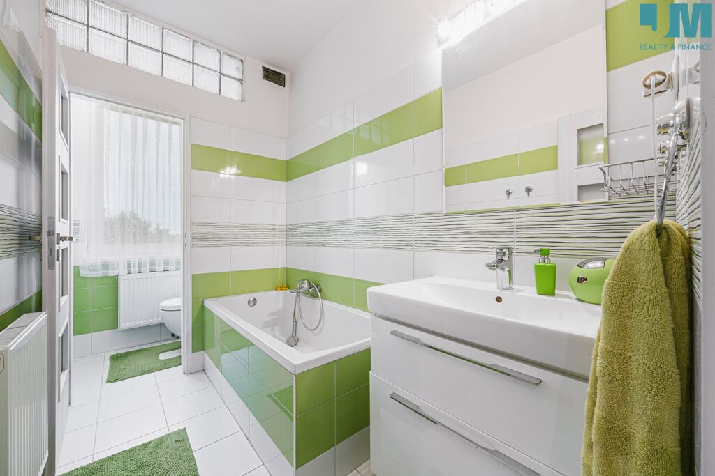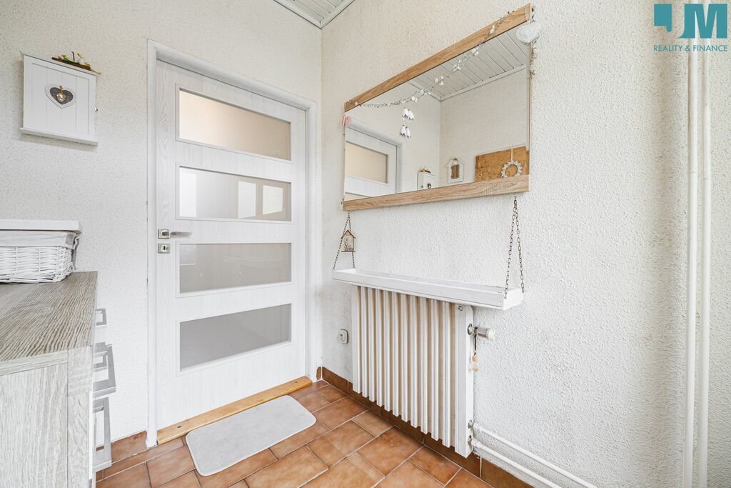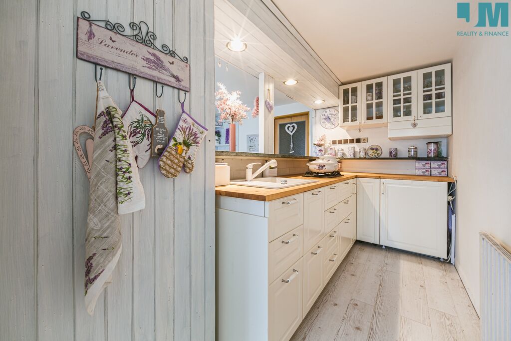 1. podlaží: zádveří (3,3 m²) a prostorná vstupní chodba (10,2 m²) s vestavenými skříněmi, kuchyň se zabudovanými spotřebiči a s jídelním koutem (16,6 m²) , obývací pokoj (22,9 m²) se vstupem na balkon, koupelna (3,8 m²) s vanou v moderním designu a samostatnou toaletou (1,2 m²). Z kuchyně vejdete přímo na nově vybudovanou terasu orientovanou do udržované zahrady s osázenými keři a ovocnými stromy.