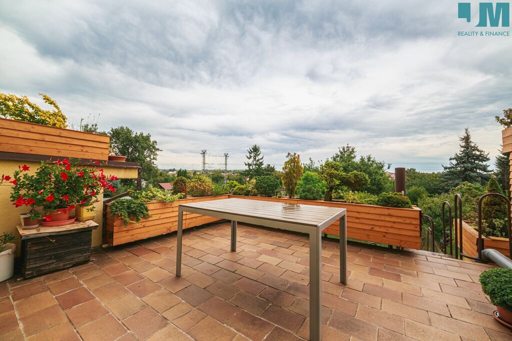 Suterén: zádveří (2 m²) v mezipatře s novými vstupními dveřmi, chodba z které je vstup do následujících místností - technická místnost (8,5 m²), spíž (7 m²), garáž (15,2 m²), sklep suchý (6,7 m²), sklep pro uskladnění zeleniny, vína apod. (5,2 m²), sklep/ponk (3 m²) a nově přistavený prostorný obývací pokoj s kuchyňským koutem (30,9 m²), tzv. 1+kk s přímým vstupem do zahrady a možností vstupu na nově vybudovanou terasu.