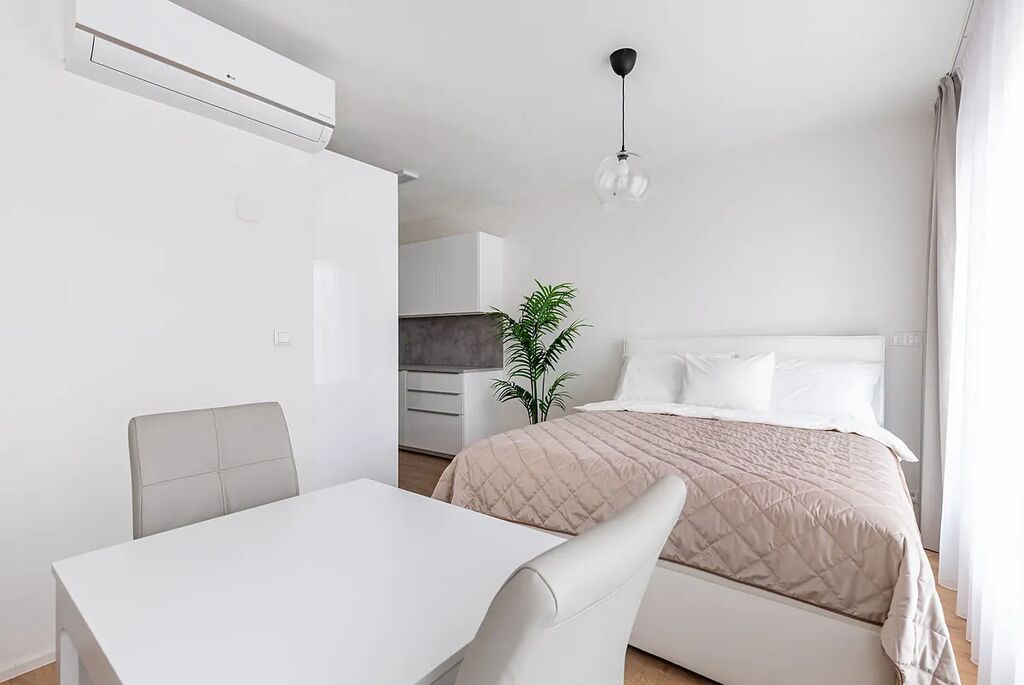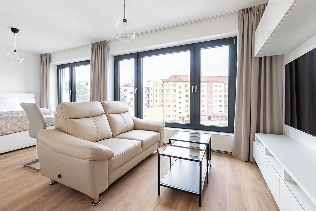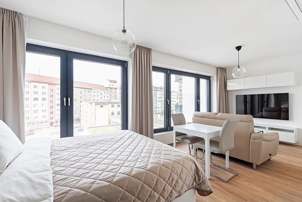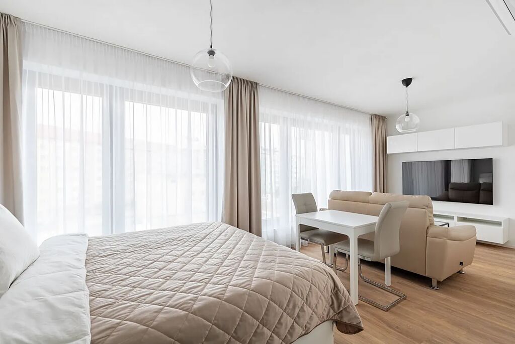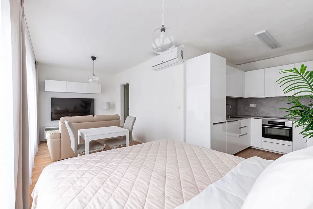 Klimatizace, kuchyňská linka se spotřebiči – myčka, varná indukční deska, horkovzdušná trouba kombinovaná s mikrovlnnou troubou, digestoř s odtahem, lednice s mrazákem, dále pak kožená pohovka, TV, stolek pod TV, stůl a dvě židle, dvojlůžko s úložným prostorem, koupelna se sprchovým koutem, pračka se sušičkou, zrcadlová galérka, vestavěné šatní skříně ve vstupní chodbě a v ložnici, stojací lampa, stolní lampička, venkovní předokenní žaluzie a bezpečnostní vstupní dveře, modem s Wifi.