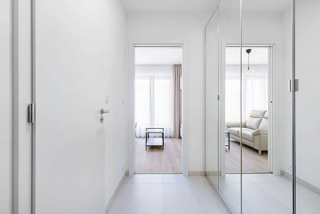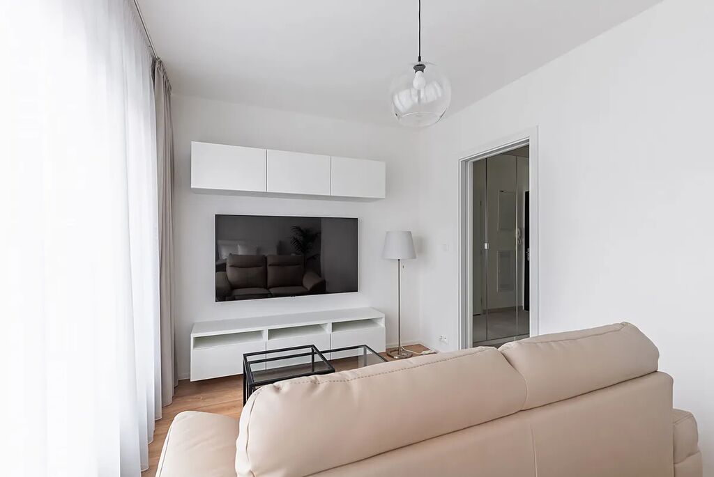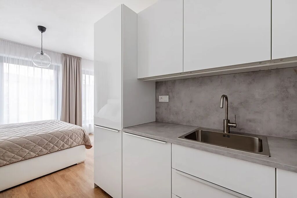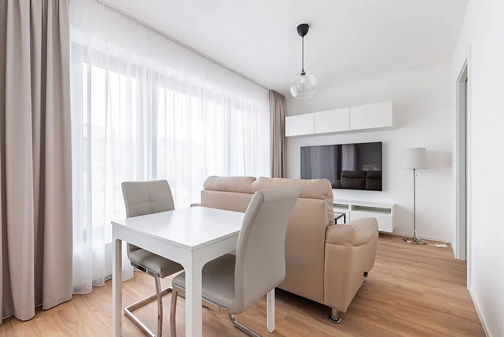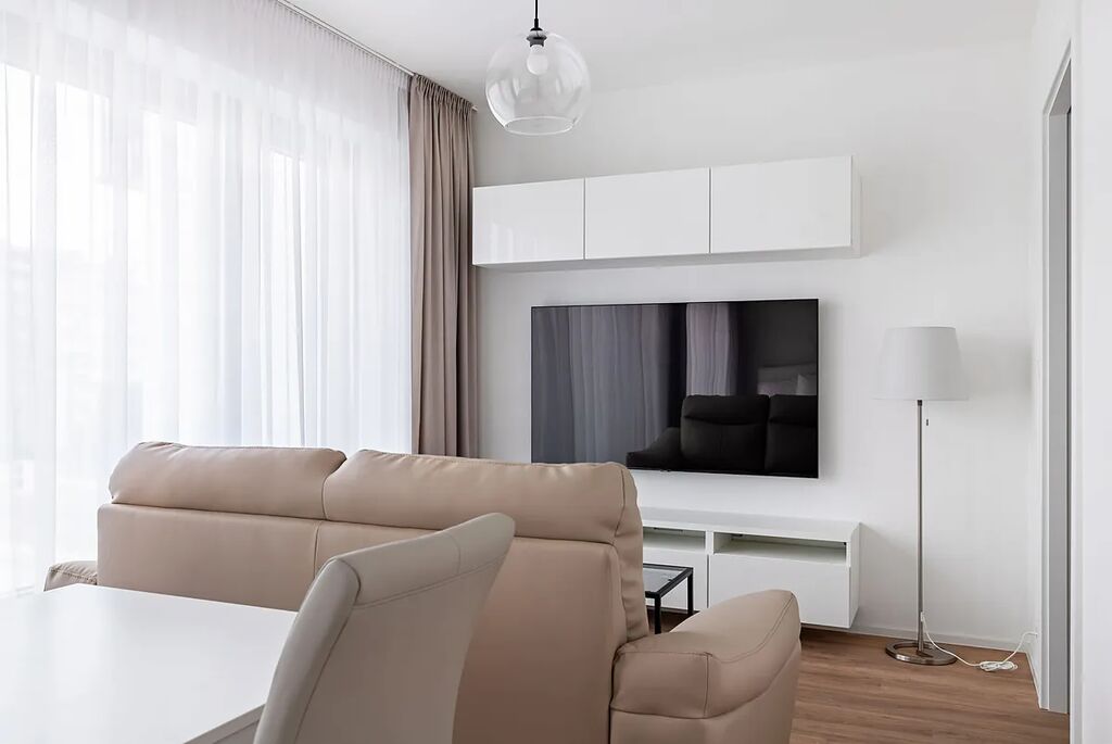 Klimatizace, kuchyňská linka se spotřebiči – myčka, varná indukční deska, horkovzdušná trouba kombinovaná s mikrovlnnou troubou, digestoř s odtahem, lednice s mrazákem, dále pak kožená pohovka, TV, stolek pod TV, stůl a dvě židle, dvojlůžko s úložným prostorem, koupelna se sprchovým koutem, pračka se sušičkou, zrcadlová galérka, vestavěné šatní skříně ve vstupní chodbě a v ložnici, stojací lampa, stolní lampička, venkovní předokenní žaluzie a bezpečnostní vstupní dveře, modem s Wifi.