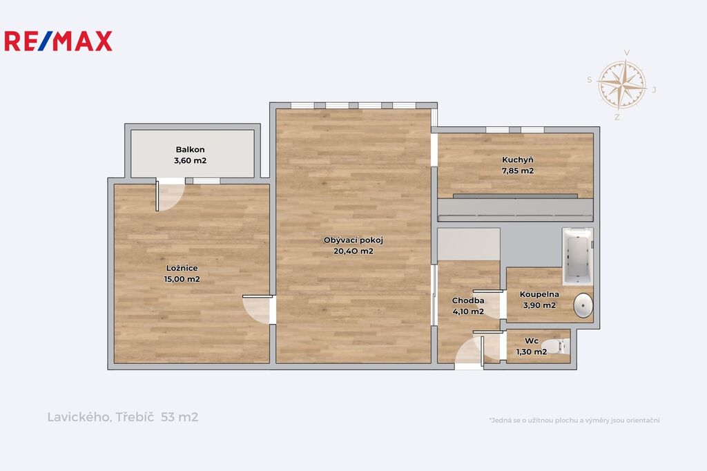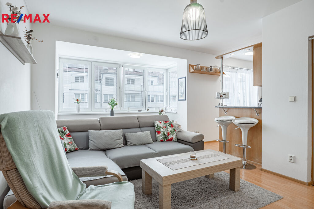 Byt o celkové ploše 53 m² + 3 m² sklepní koje je ve velmi dobrém stavu a připravený k nastěhování. Dispozice zahrnuje předsíň (4,1 m²), koupelnu (3,9 m²), samostatné WC (1,3 m²), obývací pokoj (20,4 m²) s kuchyní (7,85 m²) a ložnici (15 m²), ze které je vstup na balkon o velikosti 3,6 m² orientovaný na severovýchod.